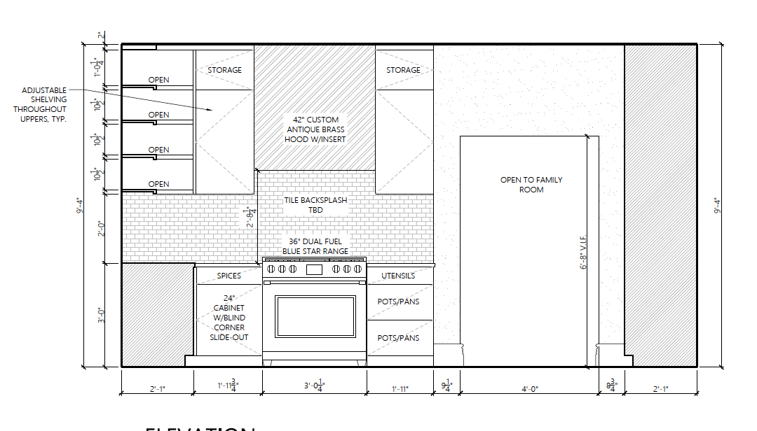 cabinet are flat front walnut panels countertop material is calacata gold marble backsplash tile is vertically stacked 2x4 dark red the hardware is brass knobs and pulls the range is a pale blue bluestar gas range the hood is antique brass flat front and fully butts up to the cabinets on both sides