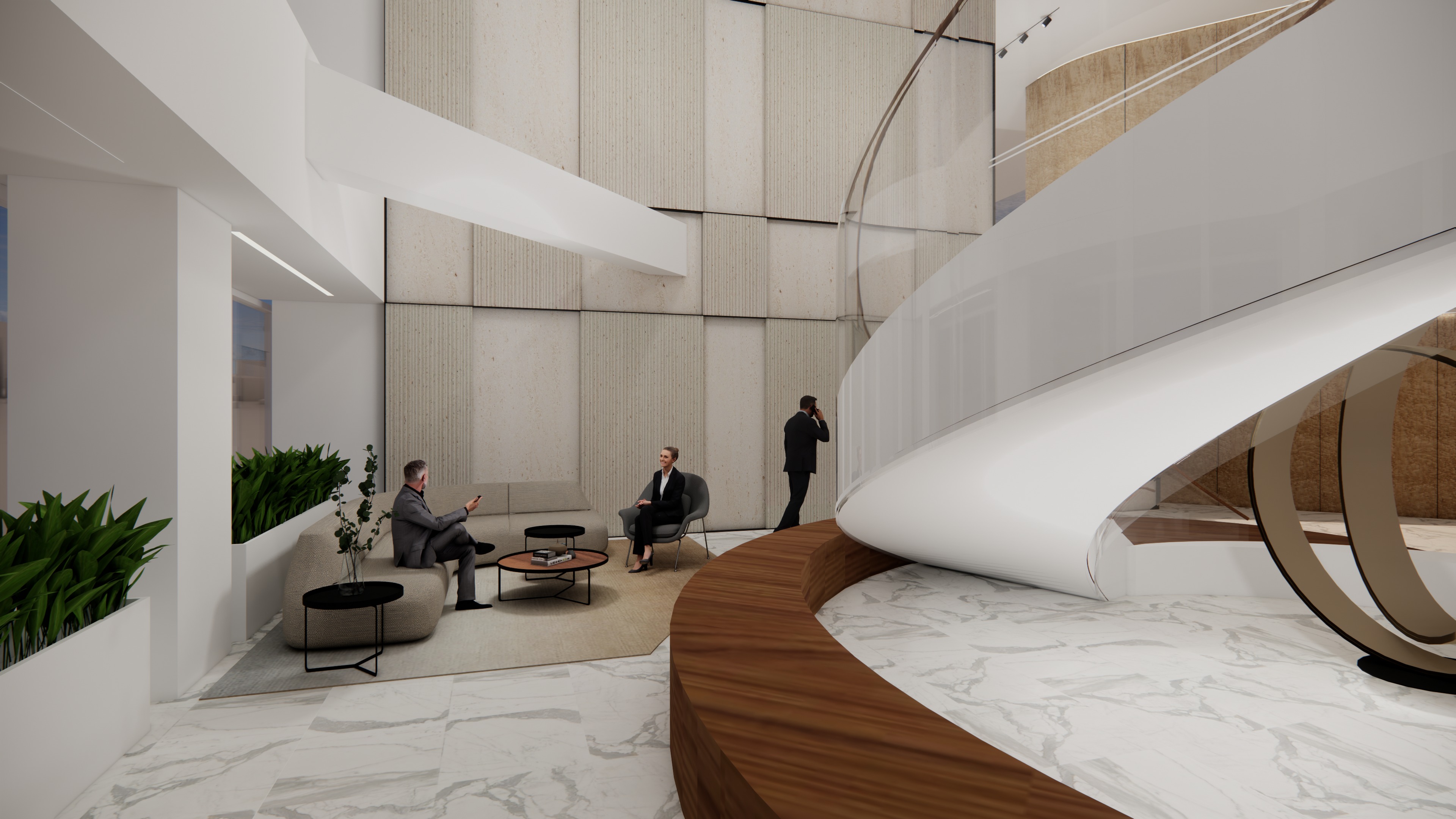 transform the provided interior image into a high end photorealistic render with soft glowing highlights and relaxed upscale energy while keeping everything exactly the same same proportions same seating same ceiling same wall finishes same materials and same spatial configuration do not move or alter any objects geometry textures colors or furniture positions all objects throughout must remain exactly in the same locations and proportions on the left windows only provide nyc building views from 44th floor in the middle of midtown new york city in the morning light