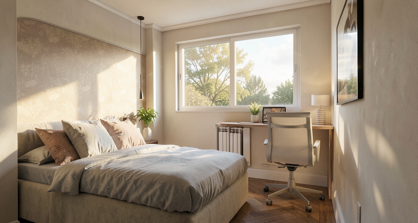 hyperrealistic architectural photography 8k resolution highly detailed textures global illumination raytracing ambient occlusion sharp focus cinematic lighting photorealistic materials uncompressed raw photo dramatic atmosphere 4 stars hotel room interior keep furniture lightning fixtures and vegetation just enhace the look of the materials