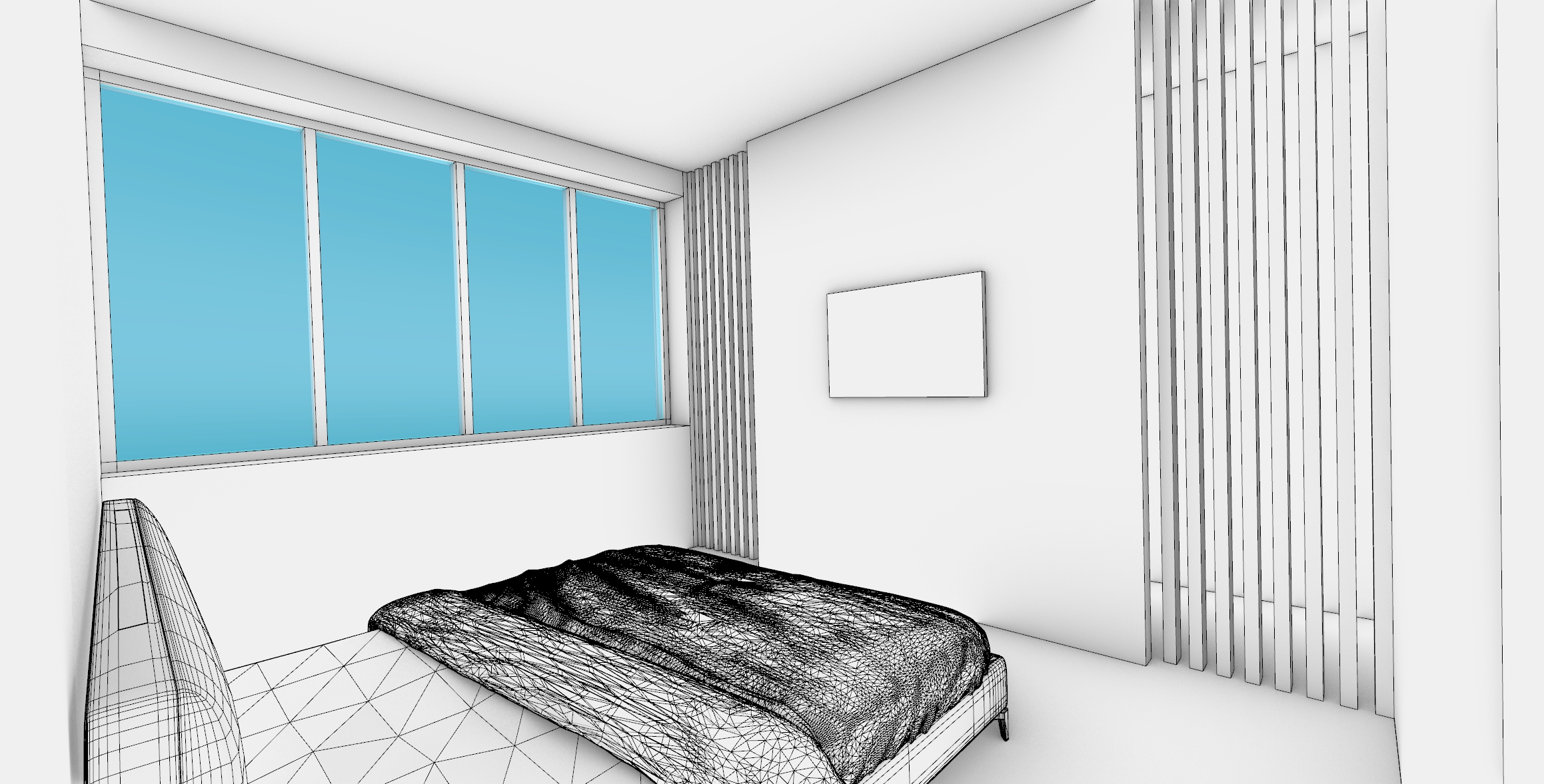 a modern style bedroom wooden oak parquet soft daily led lighting day light entering the space from the window add also white linen currtains add painting above bed head
