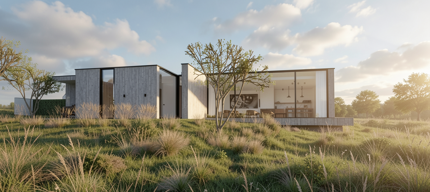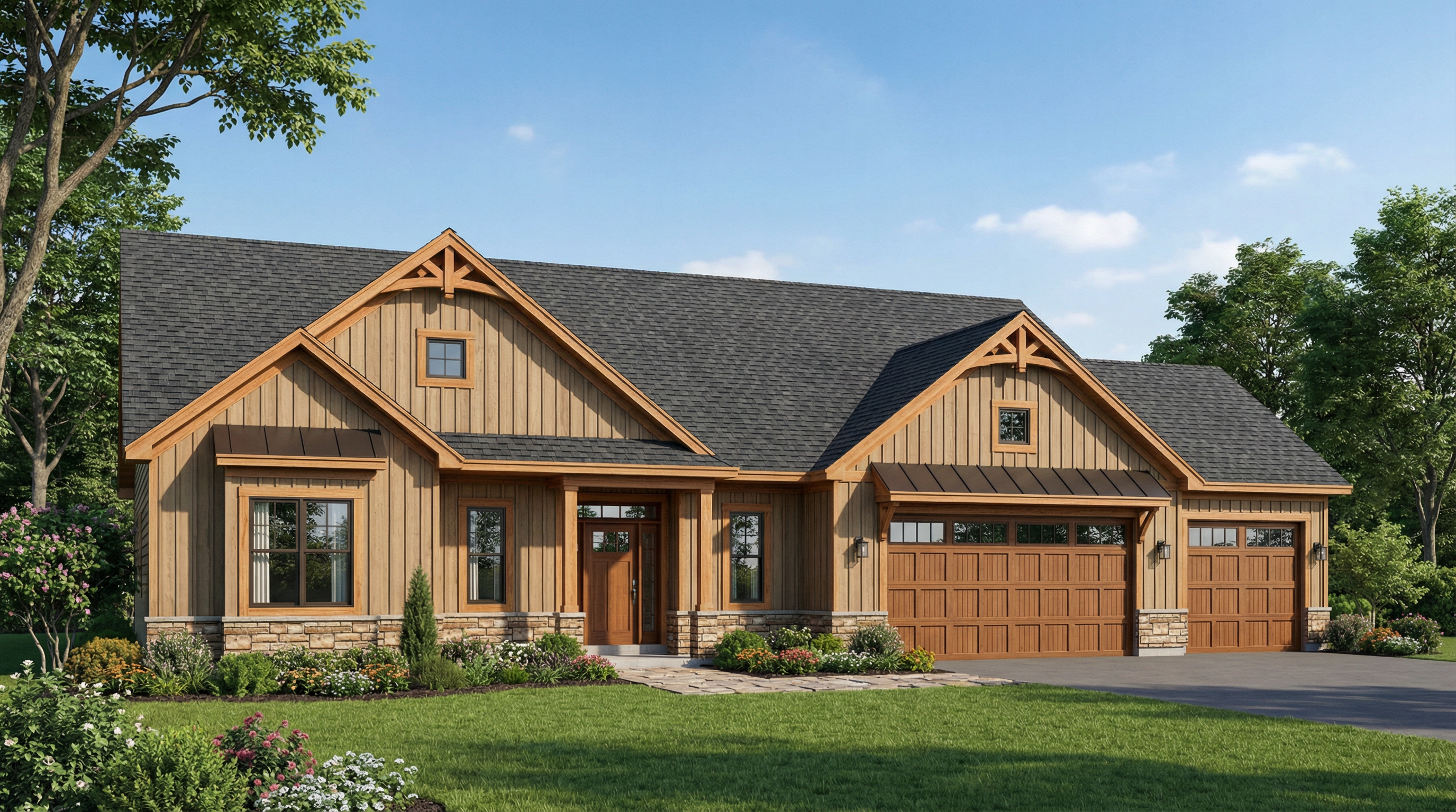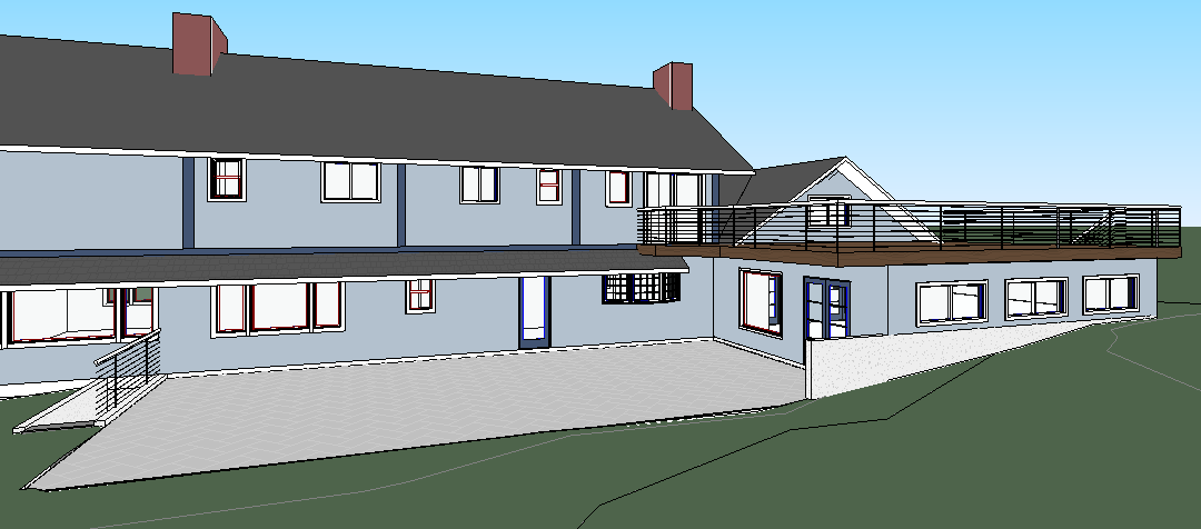 add natural lighting make look realistic add nice landscaping and surrounding trees make all the trim dark blue the light blue is stucco