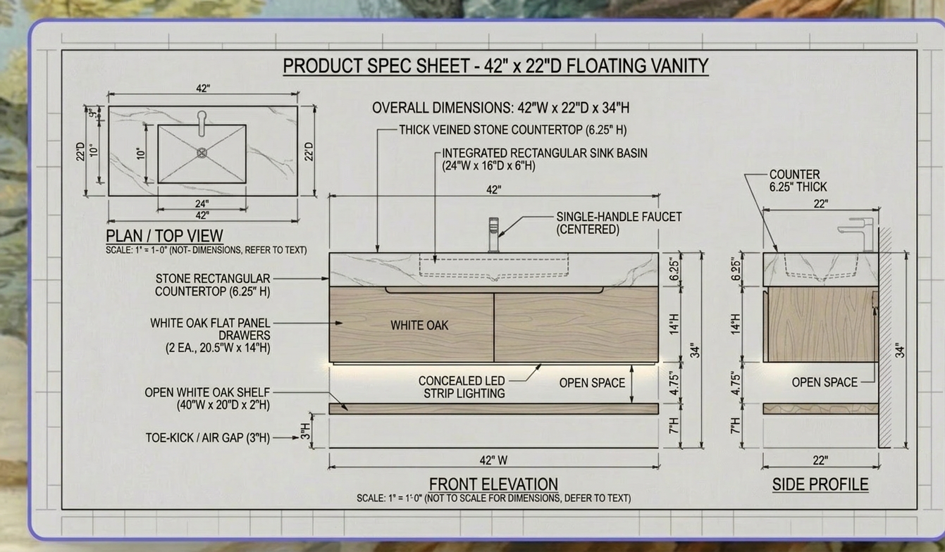 render the image of a sleek modern floating vanity with dimensions 42 x22 x34 the vanity features a thick silver travertine stone countertop it includes an integrated rectangular sink basin enhancing a minimalist aesthetic the flat panel drawers are crafted from rich white oak adding warmth with their natural grain and gentle oak brown hue below an open white oak shelf offers functional storage space concealed led strip lighting casts a soft glow creating an inviting ambiance the side profile shows a clean design with a single handle centered faucet the overall atmosphere is sophisticated and contemporary perfect for a luxurious bathroom setting