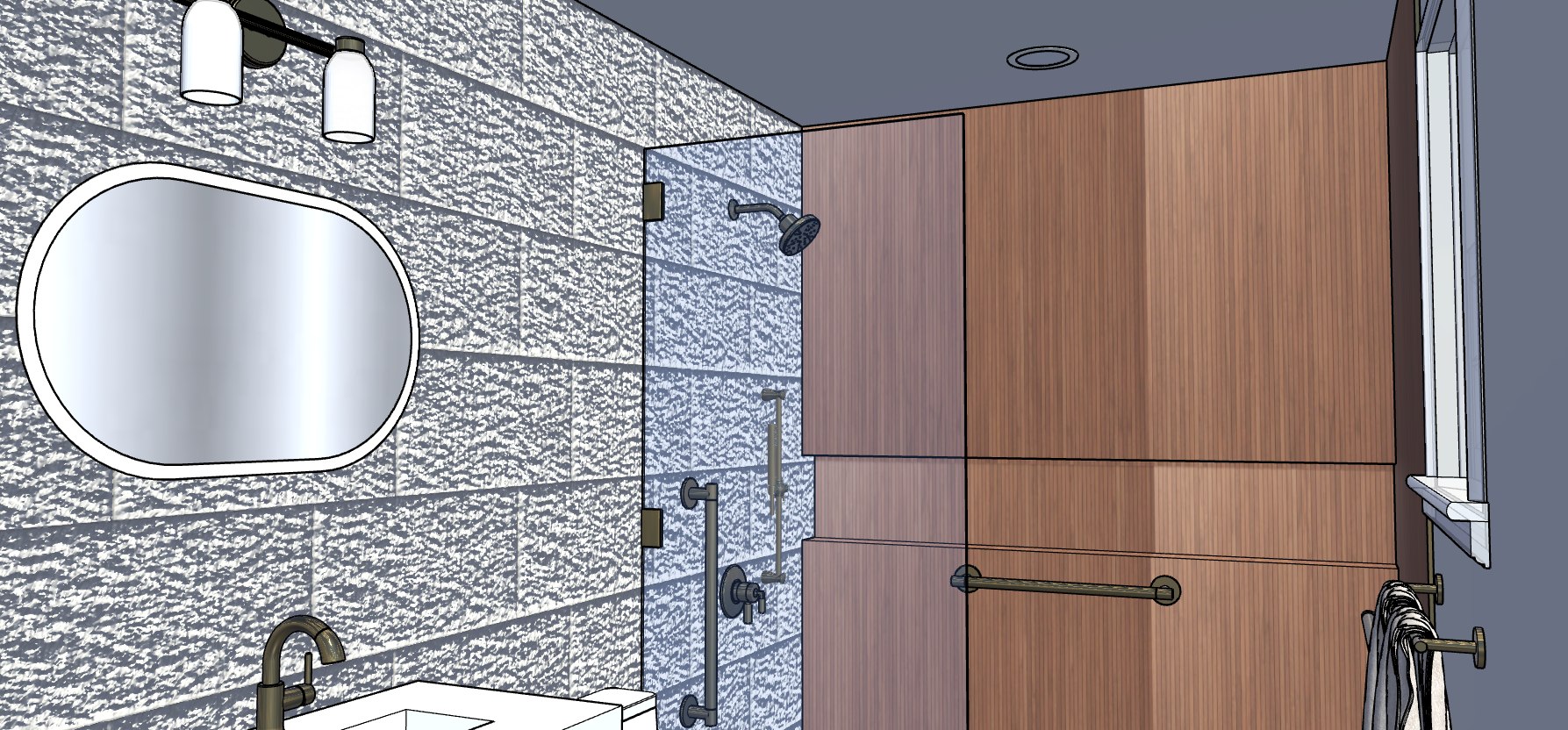 preserve all existing geometry materials and proportions lighting comes only from the vanity light mirror backlighting and ceiling fixtures the mirror has a soft white backlit halo 3000k evenly diffused the shower head and all shower fixtures are not light sources and emit no light no lighting exists within the shower or niche the back wall wood panels remain unchanged overall scene is evenly brightened using neutral 3500k ceiling lighting only do not add highlights glow reflections or new light sources