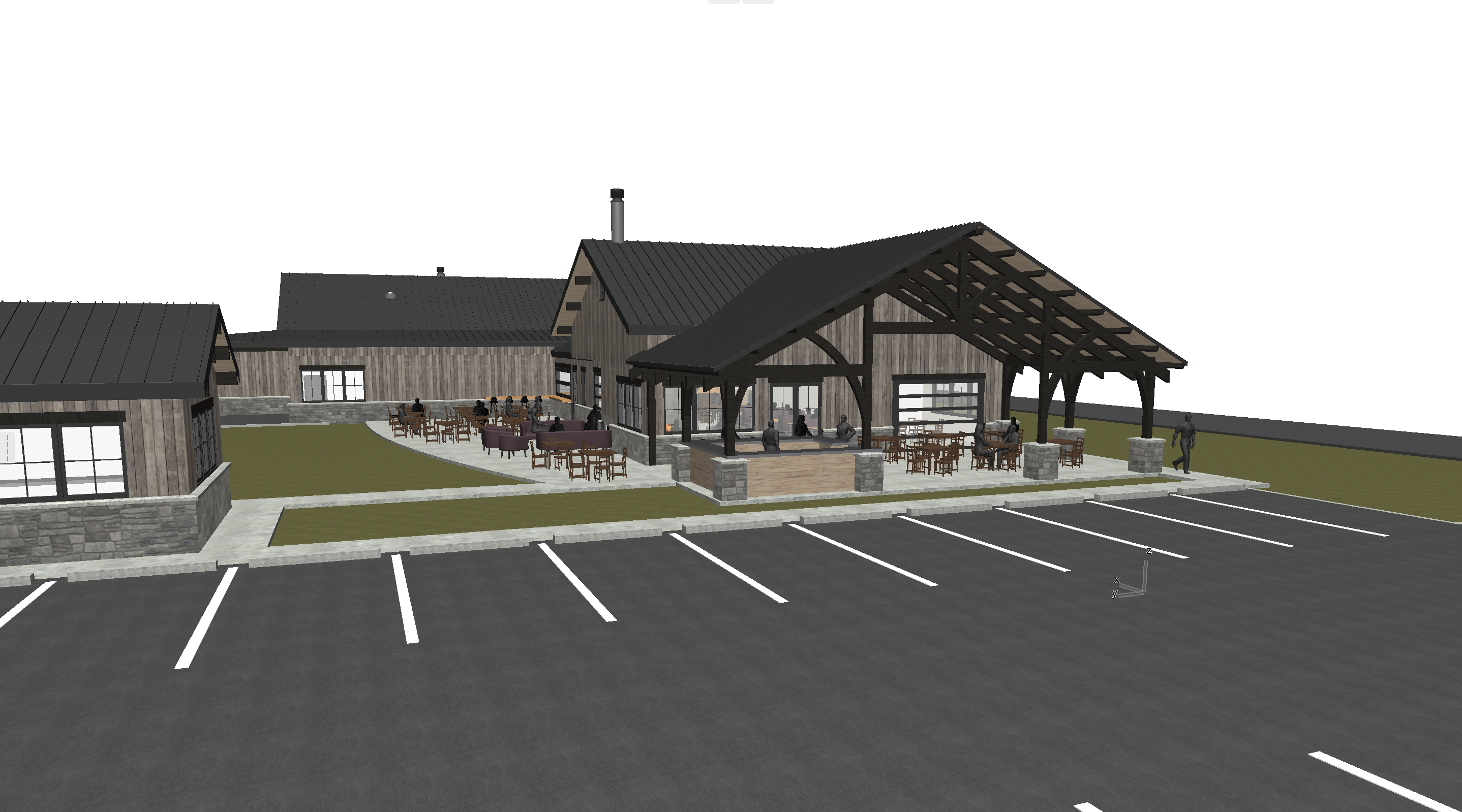 grainy watercolor rendering with watercolor trees in the background and landscaping in grass areas parking lot in the foreground