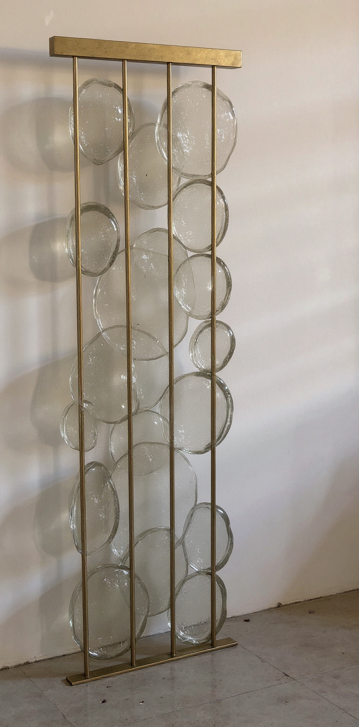 render kiln cast semi translucent glass with 1 dia dark brass rods make the glass have smaller wavy pattern rougher and more undulated make each piece more unusually round include 25 less glass pieces make the glass shapes less like circles and more curved linear shapes make this look like it s 12 high