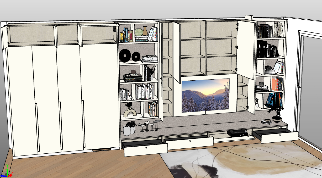 keep finishes as shown in original image add books inside the cabinets around the tv show a balcony on the 5th floor in an italian city