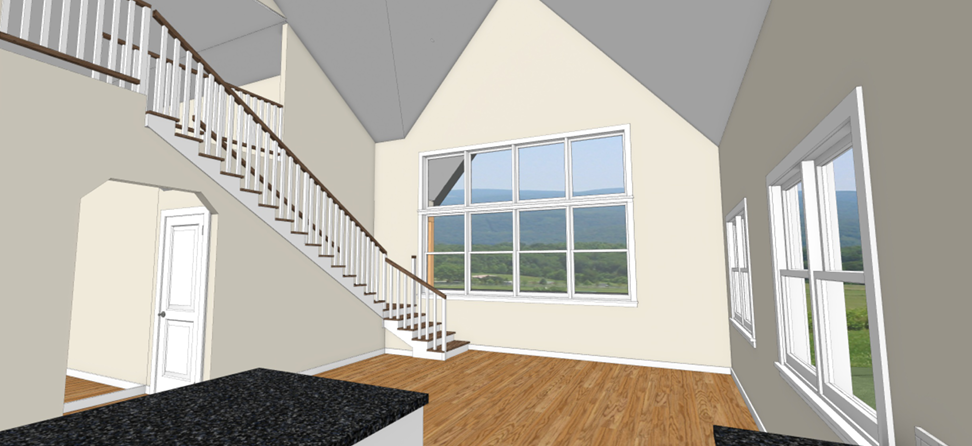 a high resolution photorealistic rendering of a modern great room interior with a vaulted ceiling the space includes large floor to ceiling windows and additional side windows that look out into a lush green forest with sunlight filtering through the trees retain all architectural features and dimensions exactly as shown white trim windows white door staircase with white railings and wooden handrails light colored walls and hardwood flooring add tasteful furniture to complete the space a comfortable sectional sofa with accent pillows a coffee table with decorative items an area rug to complement the flooring and a few indoor plants place a dining table with chairs near the windows to highlight the view use realistic materials wood grain texture on the floor and railing smooth painted wall surfaces reflective glass windows and natural fabric textures on the furniture the lighting should feel warm and inviting with natural daylight streaming through the windows casting soft shadows across the floor and furniture