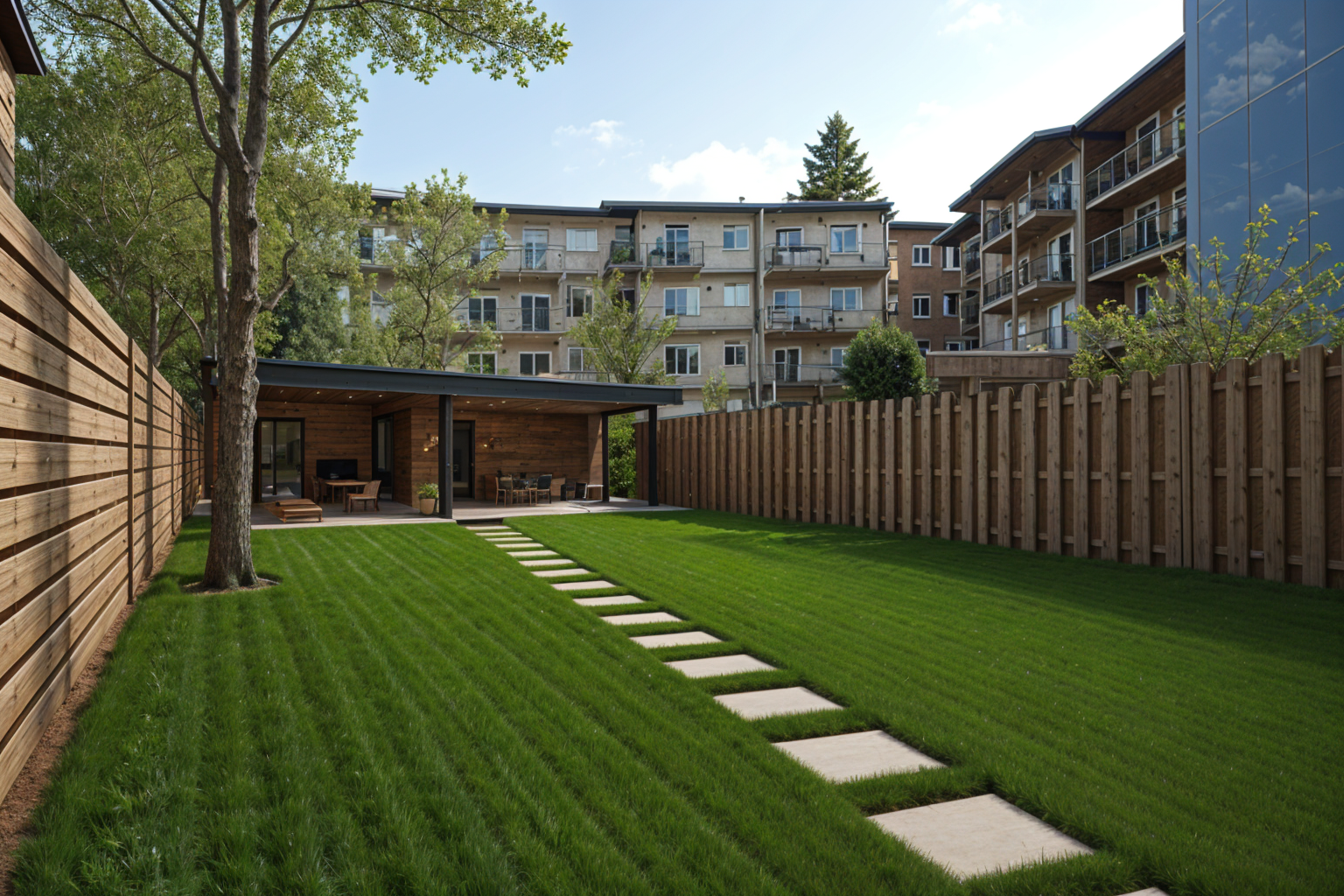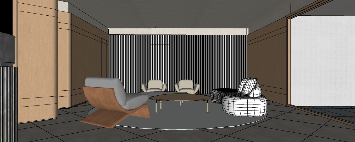 render a hyper realistic image based on a sketchup model of a contemporary living room do not change anything in the structure layout furniture placement proportions or composition only apply realistic materials lighting and rendering effects the wall behind the armchairs is covered with white vertical slats 2x1 cm the side walls are finished with natural oak wood panels and the white lateral wall has a white linen textured wallpaper that gives a subtle refined texture the ceiling should be rendered with a burnt cement style textured paint finish not blocks or concrete panels in light beige and gray tones creating a smooth continuous surface the floor is made of large dark gray porcelain tiles the furniture includes two light beige upholstered armchairs a curved sofa remove the wireframe lines and render it in a light gray fabric upholstery and two coffee tables one in natural oak wood and the other in white calacatta marble placed on a gray circular rug lighting should be soft and natural as if coming from large side openings with a warm tone that enhances the natural materials the overall atmosphere should feel cozy elegant and realistic with accurate reflections smooth shadows and precise material definition style professional architectural photography 35mm lens realistic archviz render soft global illumination neutral color correction natural tones and high detail