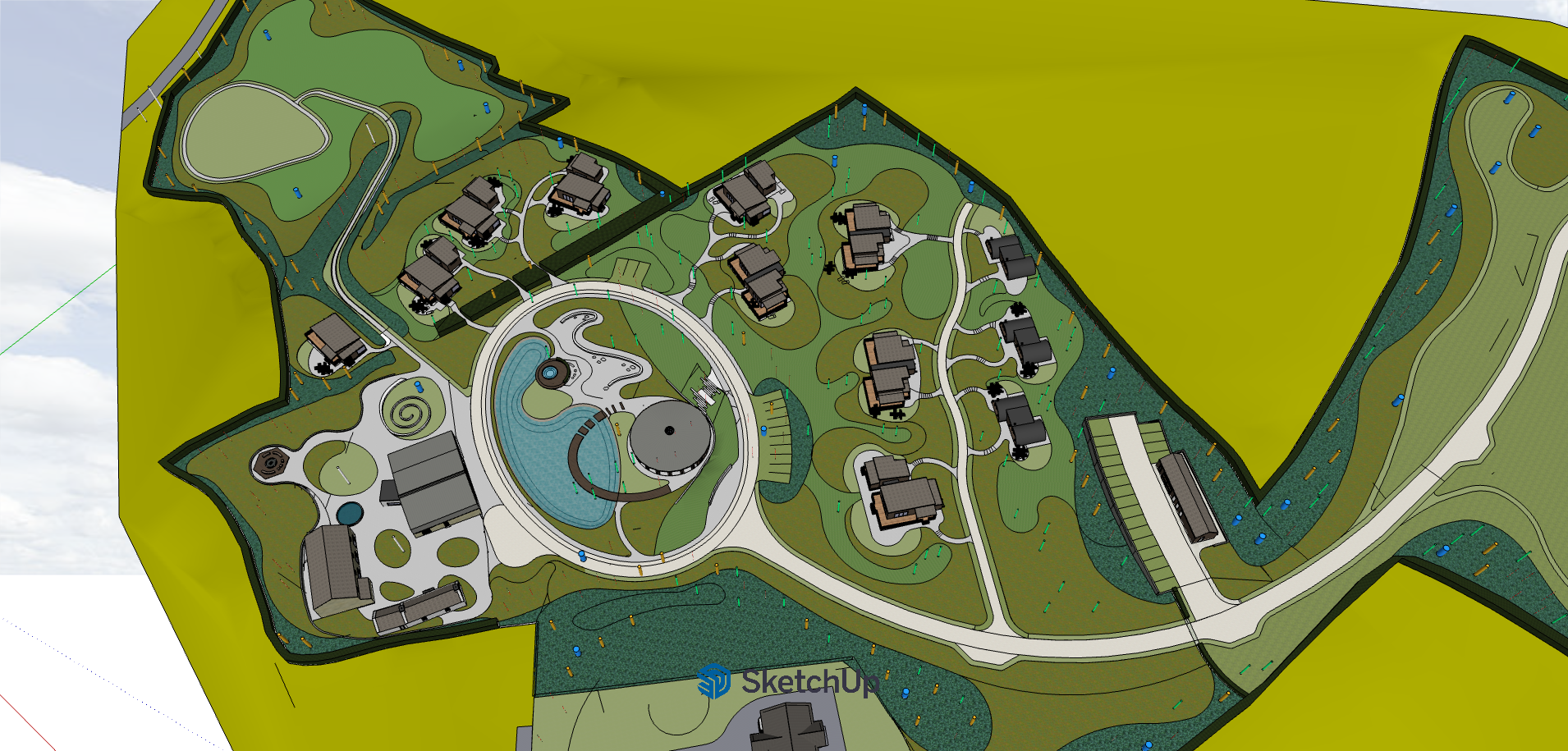 vibrant full of life watercolour illustration of wellness resort same proportions lighter green section is rolling hills and surrounding fields
