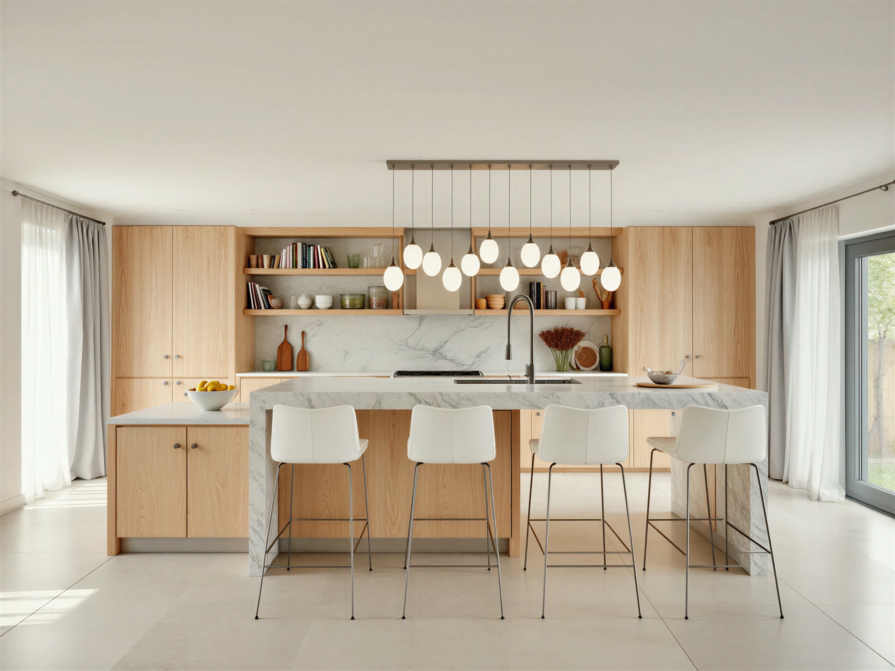 a contemporary kitchen with a large luxurious kitchen island as the focal point the island features a marble countertop with clean sharp edges and it provides seating for four people with modern white stools above the island there is a sleek pendant light fixture with several spherical bulbs providing a soft and ambient glow the cabinetry is made of light oak wood creating a warm natural feel that contrasts beautifully with the white marble and soft tones in the space open shelves above the counter hold a mix of decorative items such as books and glass jars adding character and functionality the kitchen also features state of the art appliances including a cooktop integrated into the marble countertop and a faucet at the island large windows on the left side allow for ample natural light creating a bright and airy atmosphere while sheer curtains help soften the light the room has light colored floor tiles enhancing the modern minimalistic look this kitchen feels spacious clean and welcoming with a perfect balance of elegance and practicality architecture