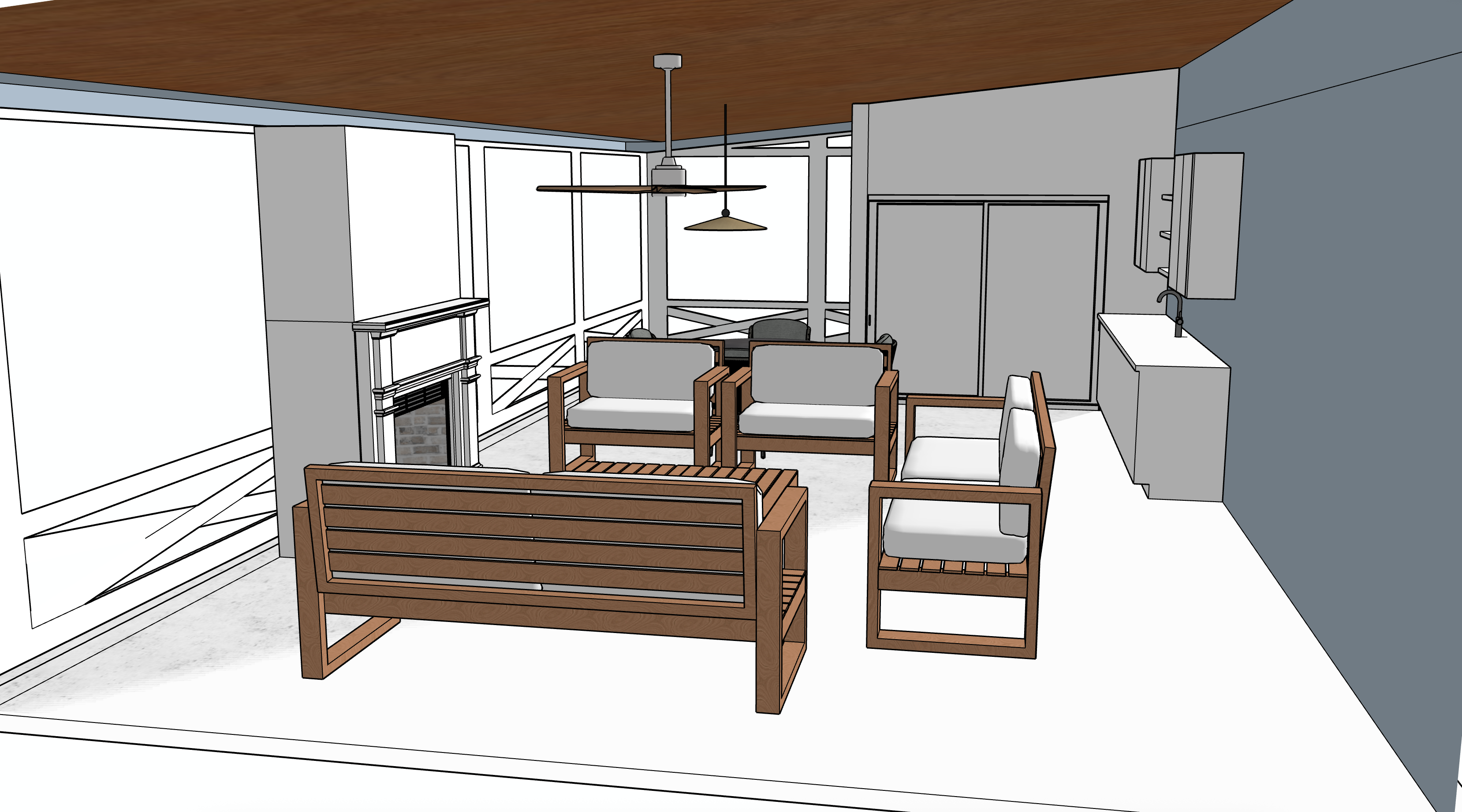 render this as a screened in porch 3 season room with a ceiling fan above the seating area use decking on the floor surface make it sunlit and inviting