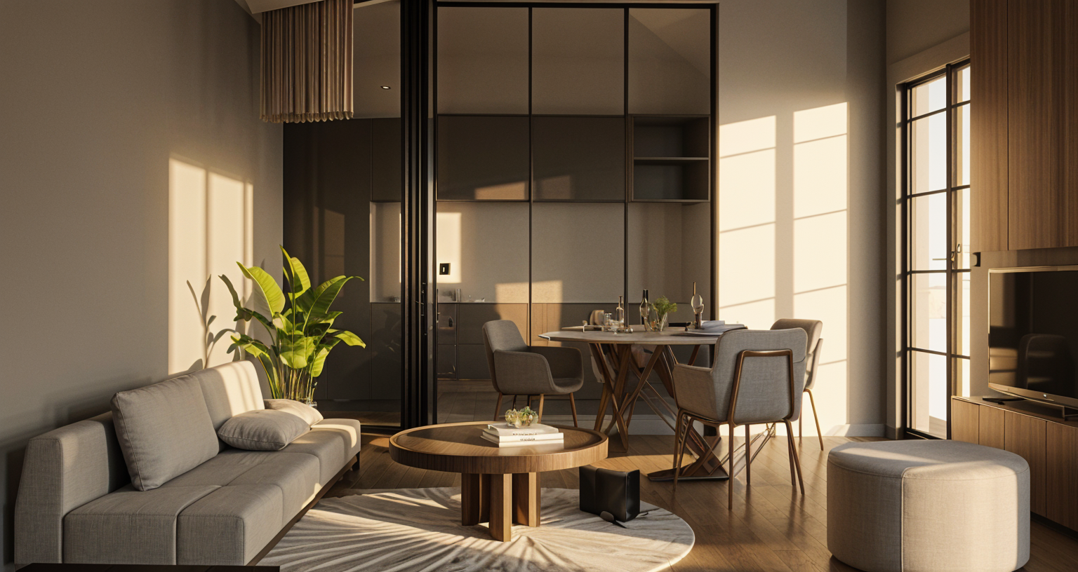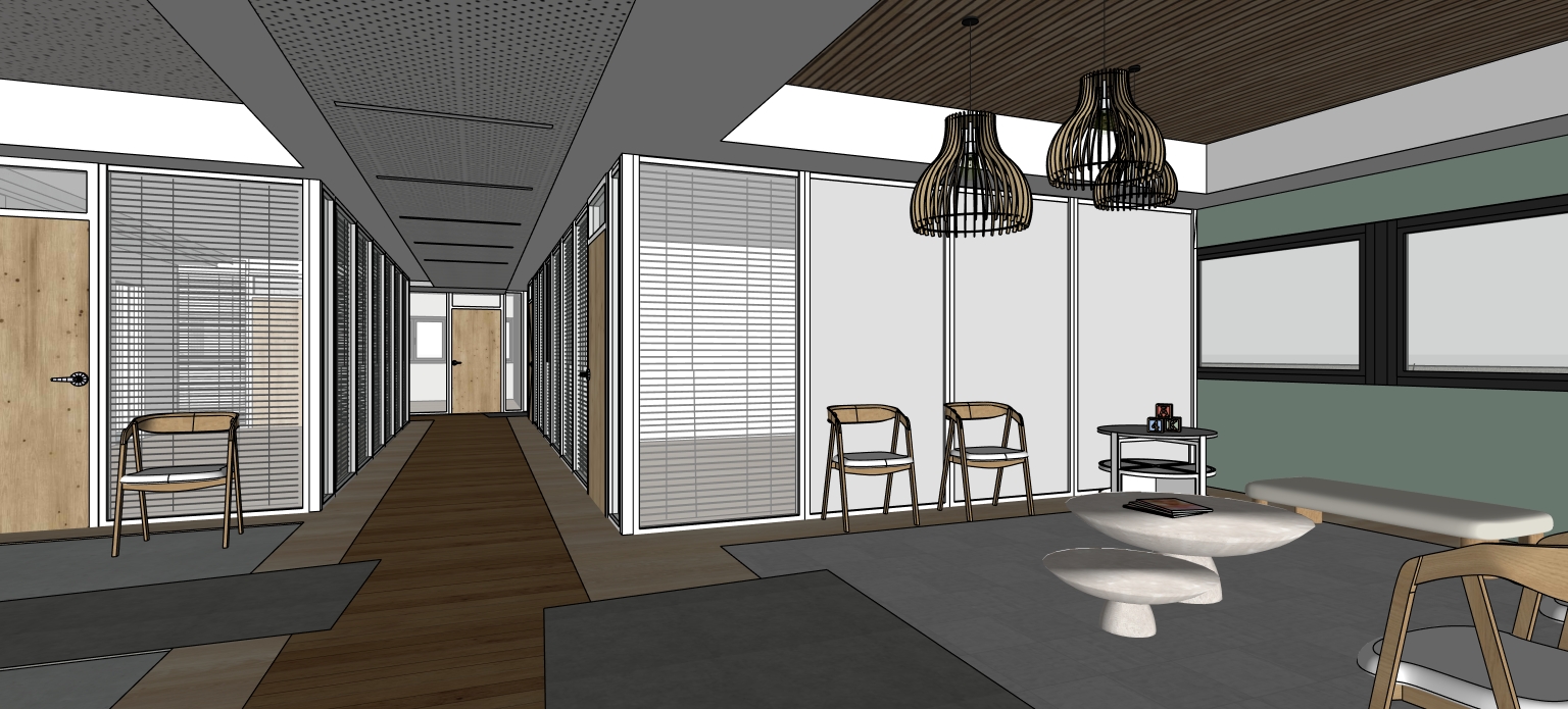 la pi ce se situe au 1er tage et la vue est compos e de v g tation et d immeubles bas les suspensions sont allum es le couloir est clair par les dalles led pr sentes les profil s des cloisons amovibles sont blancs la table ronde dans le coin de la salle d attente est blanche les cloisons pleines sont gris clair mat pas de spots suppl mentaires rajouter un montant vertical la fen tre noire de gauche avant la cloison enlever le poteau noir cot de la chaise
