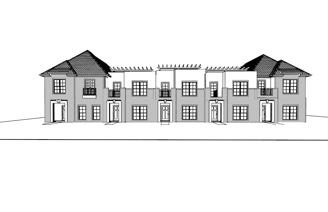 create a realistic scene do not add any architectural elements do not change the how the building looks do not add windows doors or any other architectural element just enhance what is already there the materials for the exterior of the quadplex is a light white stucco and light brown brick do not plants to the building