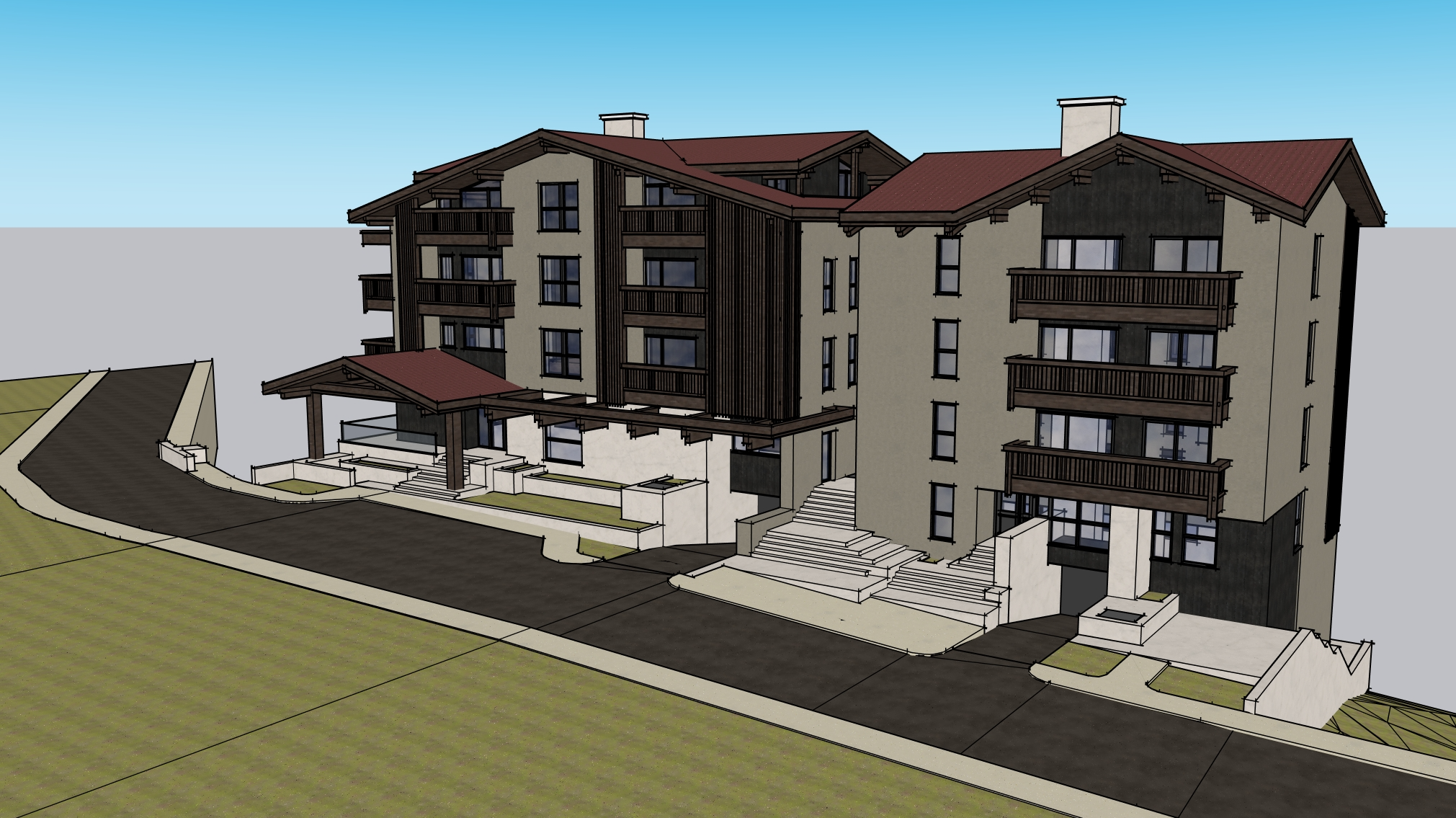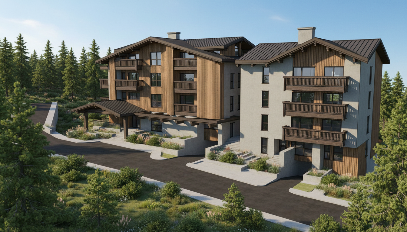 exterior shot keep original architecture intact don t change windows proportions lots of vegetation pine tree forrest but keep where the white walls are