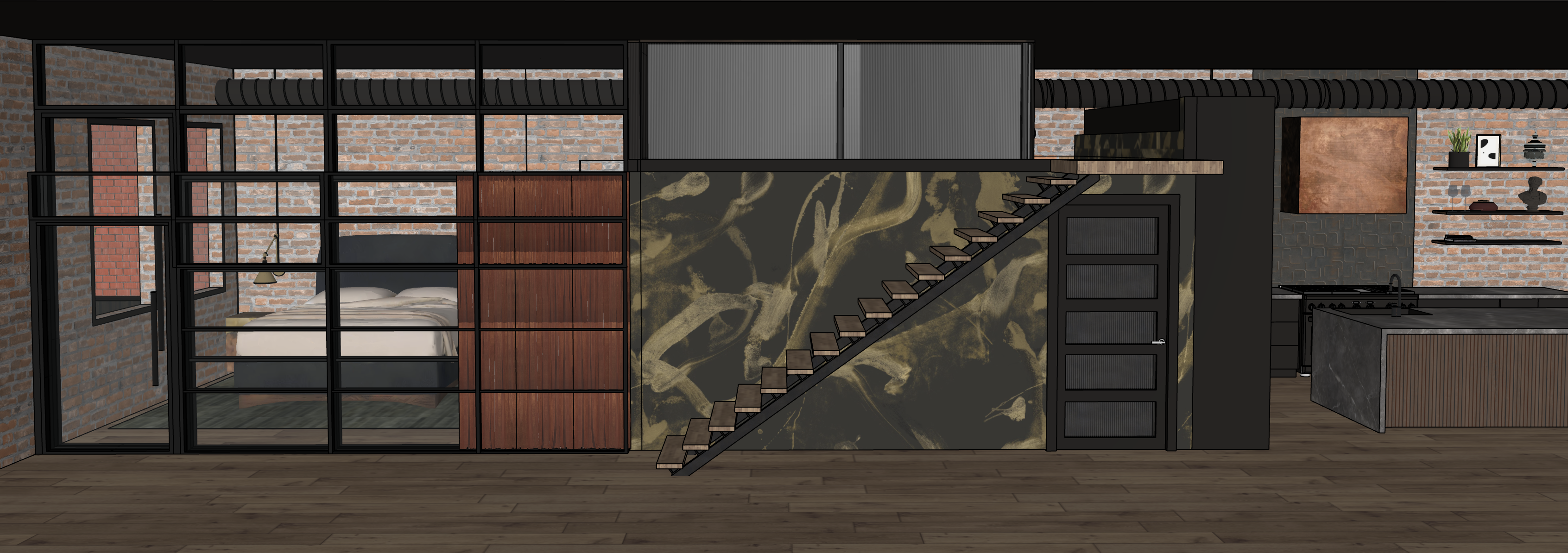 create a beautifully rendered image of a modern industrial kitchen feature exposed brick walls in muted orange and grey tones and include black metal accents for a sleek urban look the cabinets should have a rich walnut wood appearance complemented by dark granite countertops the open shelves should display minimalist decor with matte black and soft earth toned objects for a contemporary feel use warm ambient lighting to enhance the cozy atmosphere casting gentle shadows across the textured surfaces incorporate metallic elements like a copper exhaust and brushed steel fixtures to add a refined industrial edge the flooring should be a rustic medium dark wood balancing the overall aesthetic