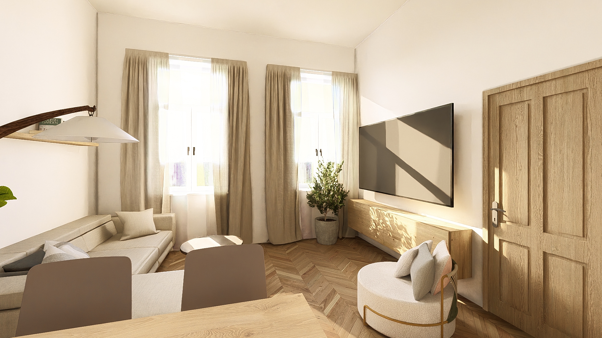 make this render more realistic dont change the colors and the shapes dont replace the standing lamp next to the sofa