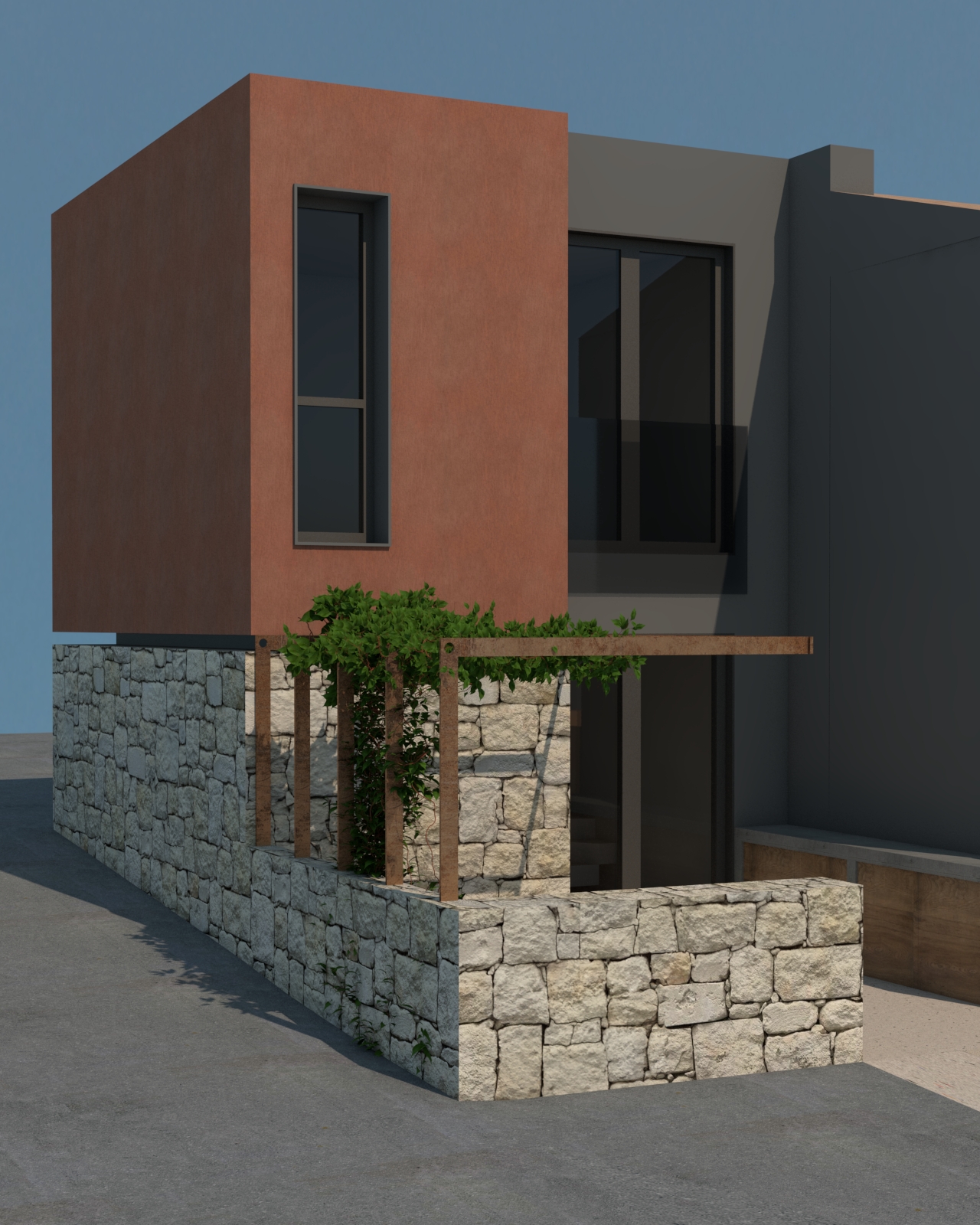 modern house partially embedded in rugged stone walls warm earthy terracotta fa ade with a matte mineral plaster finish natural daylight enhances warm shadows and depth creating a calm mediterranean atmosphere calm serene atmosphere high end architectural photography ultra realistic sharp focus