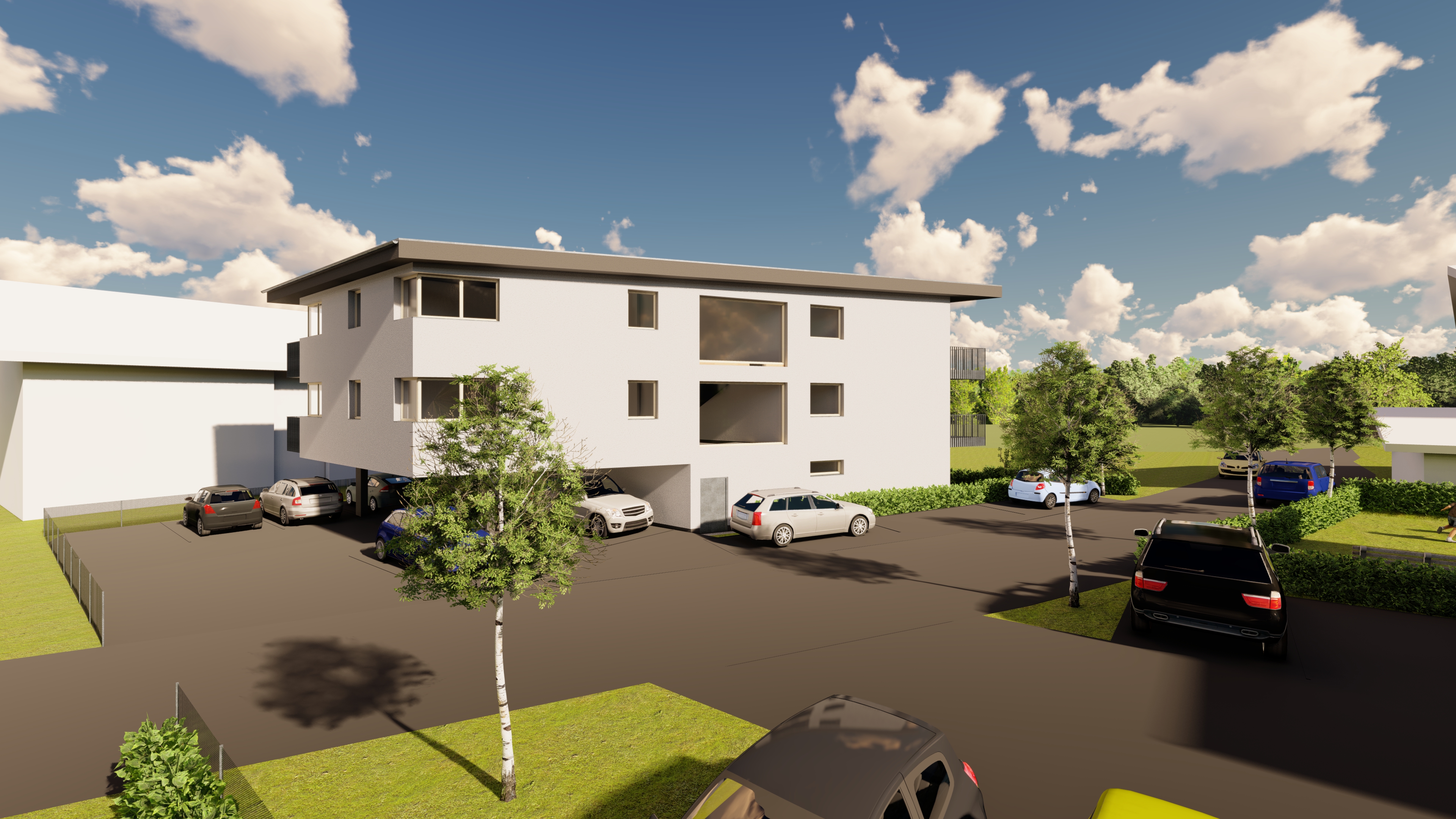 render the scene on a beautiful spring day the materials and colors must be maintained the facades in smooth plaster the windows as white plastic windows the balcony railings in galvanized dark steel the balcony partitions are executed in wood depict the lawn realistically add a few people to the image the entire image in realistic and vibrant light