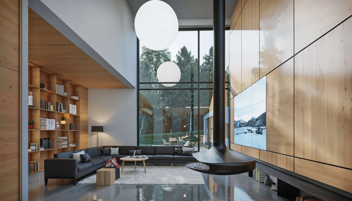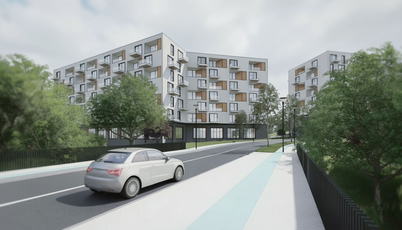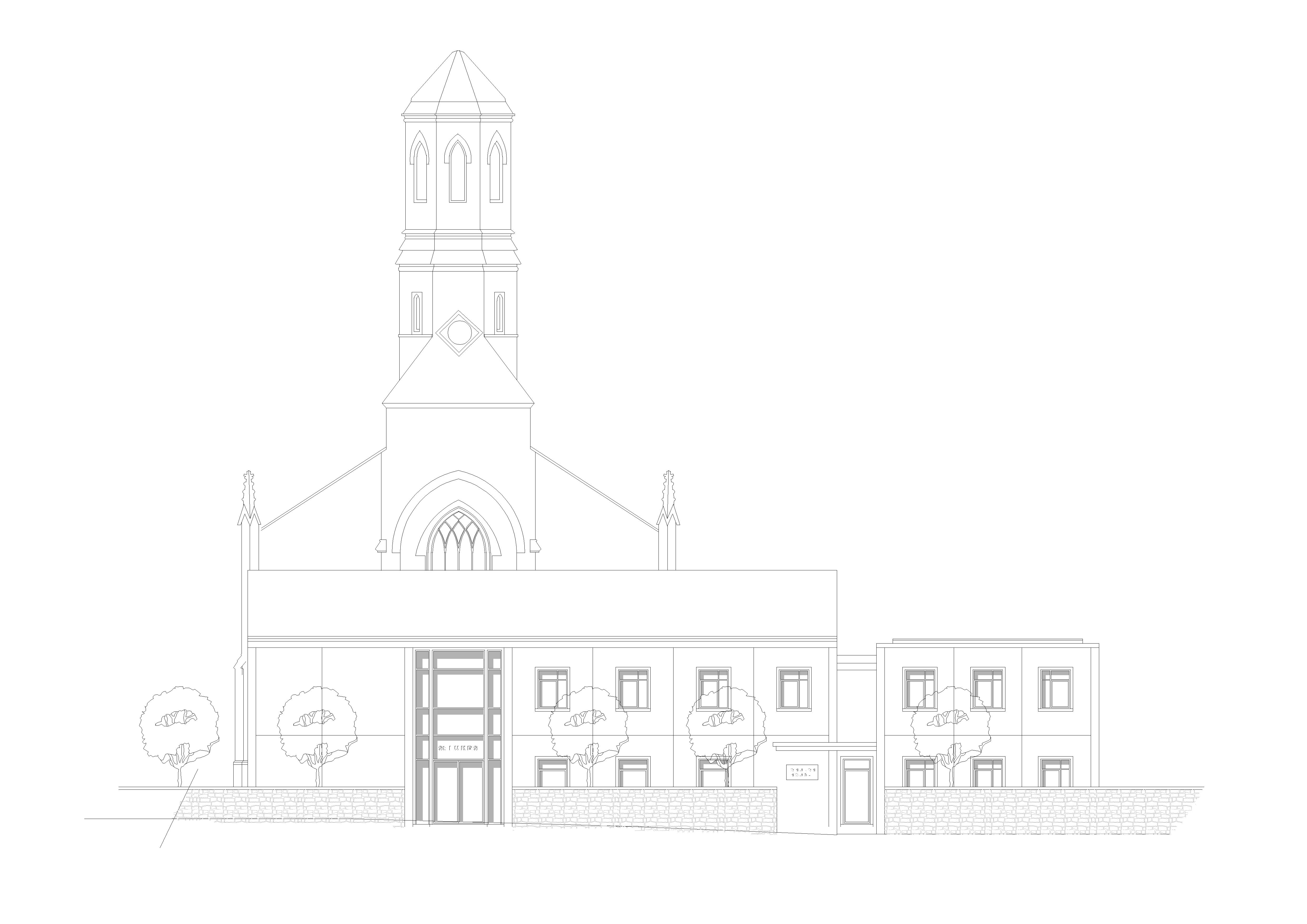 render this line drawing to include white panel clad walls anthracite window frames lush green trees grey stone walls to the church tower in the background highway in the foreground no extra trees