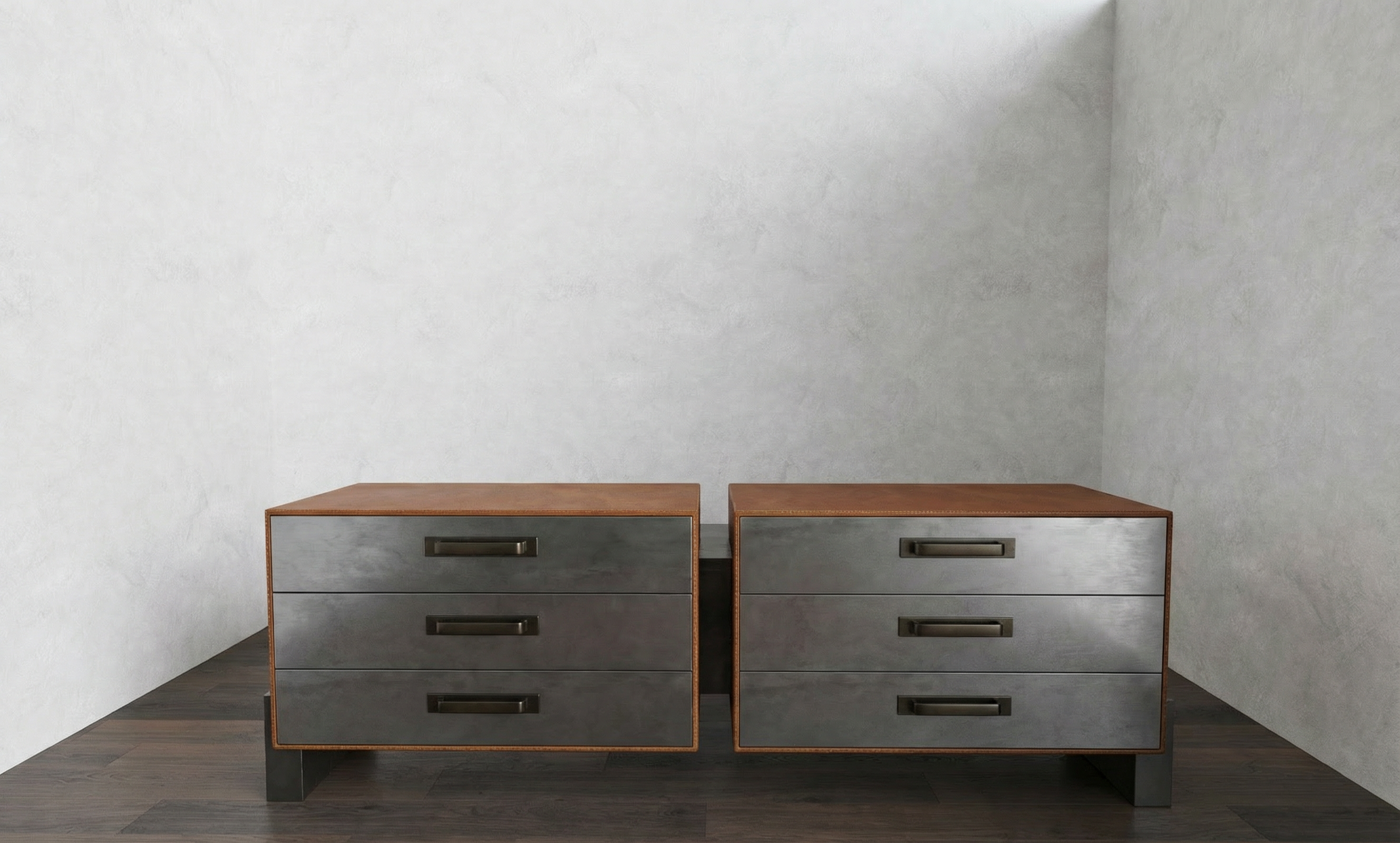 make this more photo realistic without changing any of the materials the surround is cognac leather the drawer fronts are pewter metal the handles are bronze metal the legs are black panthus slab dont change anything else