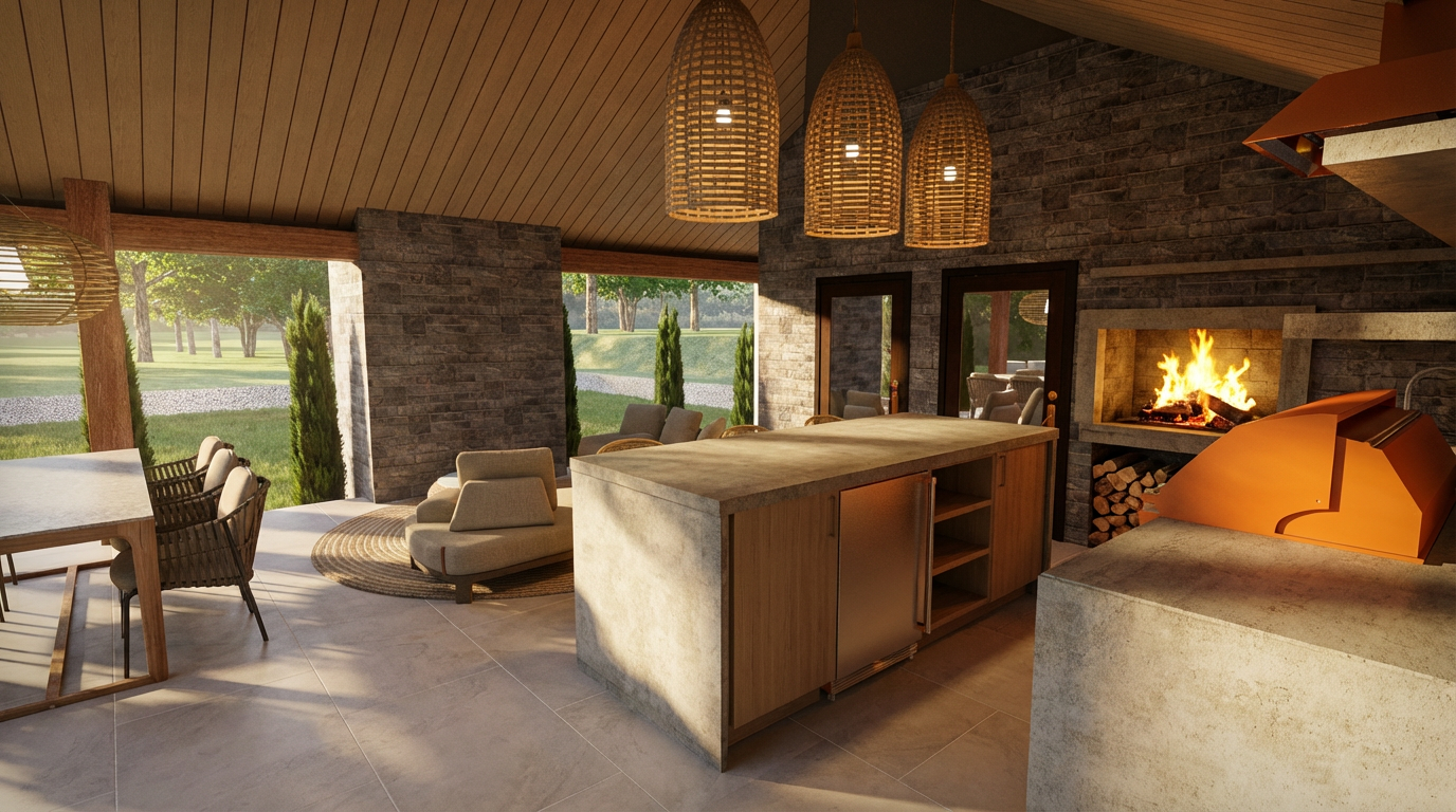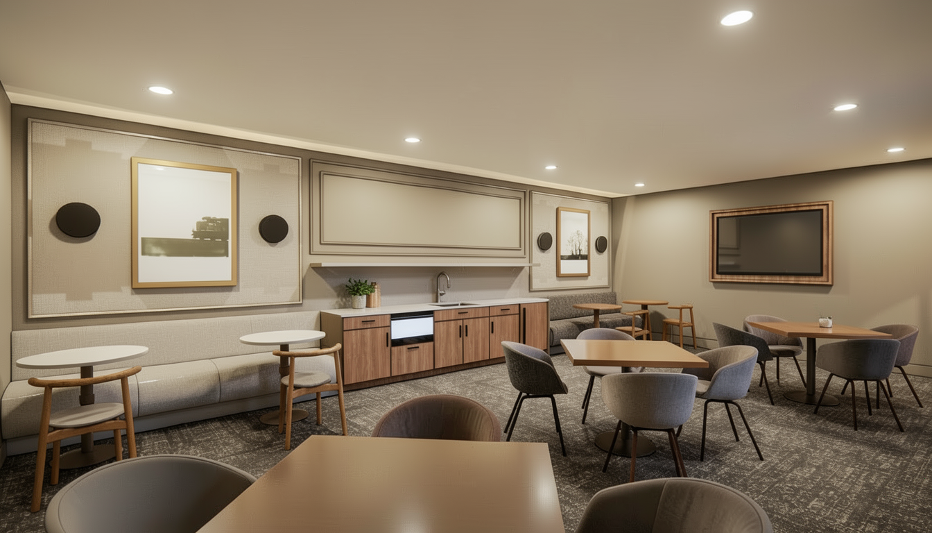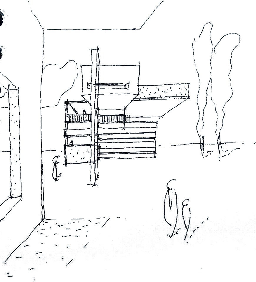 a modern architectural scene with a spacious plaza featuring a contemporary building with geometric lines and large glass windows the building facade is a blend of sleek concrete in light gray and glass with subtle reflections trees around the area are tall and slender with lush green leaves the sky is a vibrant blue with soft white clouds the street is paved with light gray cobblestones creating a serene and inviting atmosphere scattered people are walking wearing casual pastel colored clothing giving a lively and pleasant feel to the environment