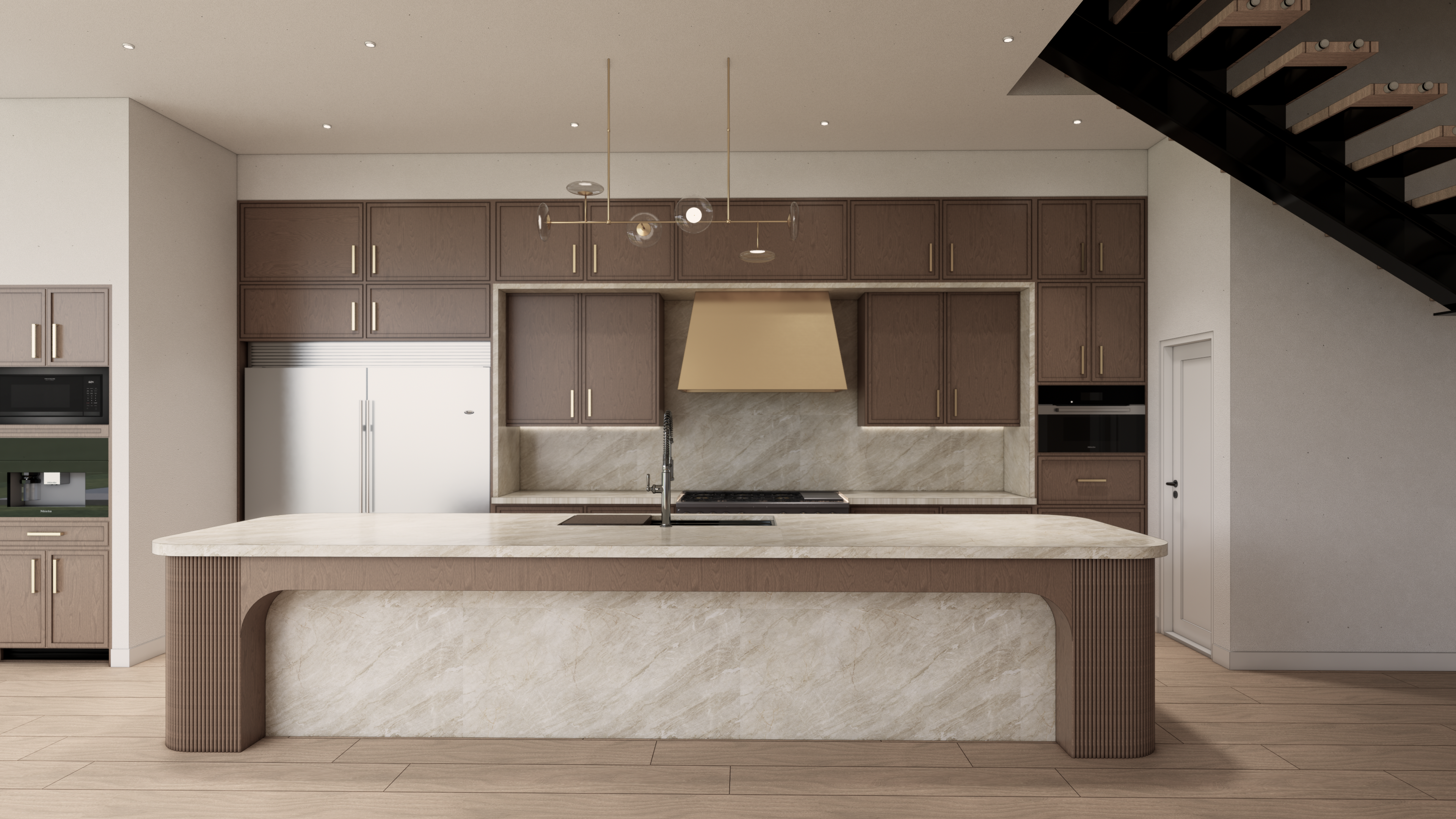 modernist interior shot give me ideas for to mix the gold brushed brass hood and the washed walnut wood architecture