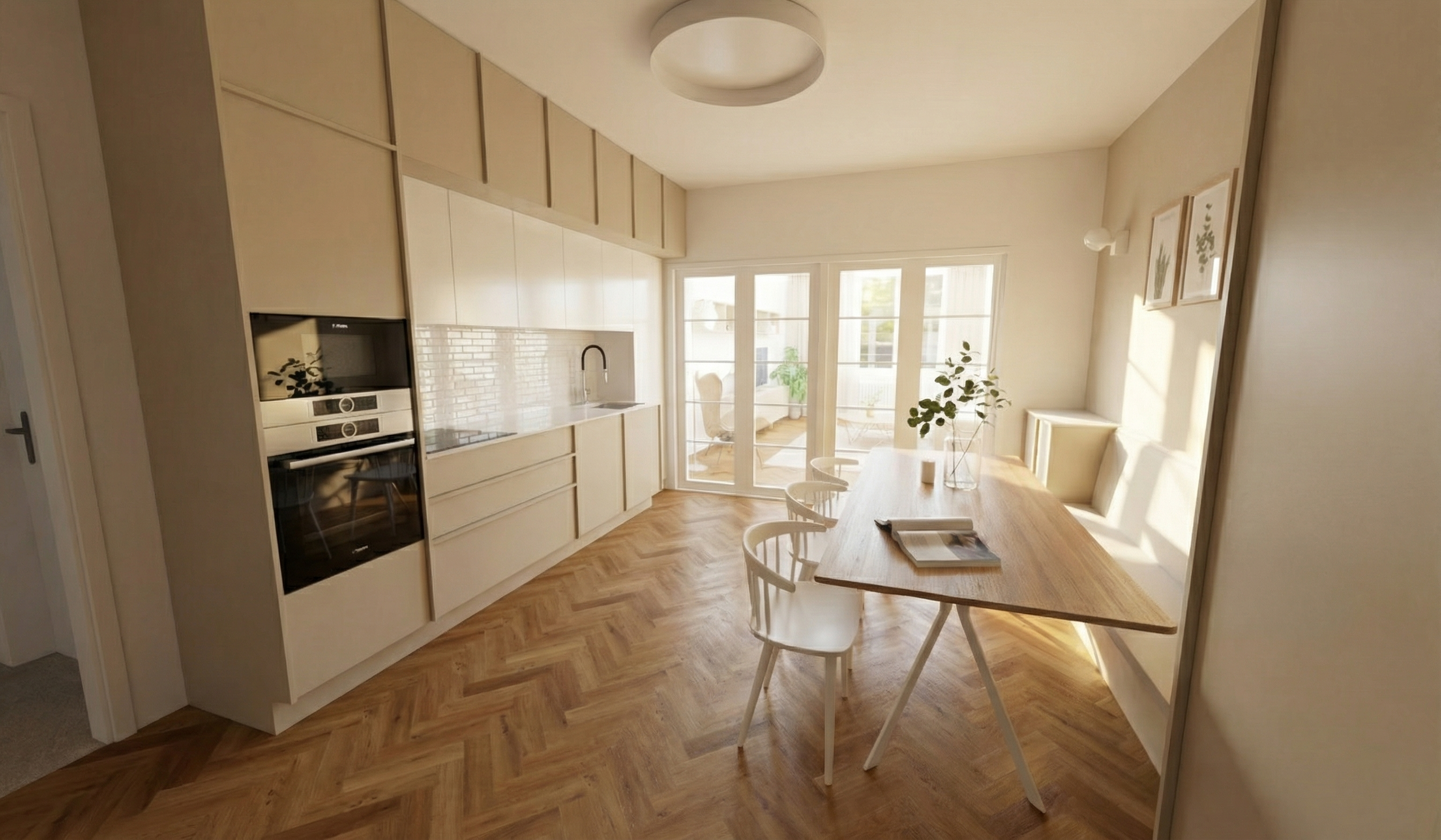 refine this image into a photorealistic architectural render while preserving the exact design layout and proportions do not redesign or reinterpret the architecture maintain the same roof structure columns slat screens bed platform and camera angle columns structure the vertical support elements are not concrete render them as light gray high end smooth stucco subtle plaster texture matte finish slightly softened edges and corners micro rounding not sharp or knife edge clean refined contemporary stucco not rustic not heavy not rough edge softening reduce overly sharp geometric edges throughout apply subtle rounding appropriate for real construction especially on stucco columns wood edges and transitions do not change dimensions or shapes only soften realism wood all wood is rift sawn oak light natural stain neutral undertone not orange not overly warm fine straight grain with subtle variation matte finish no gloss do not darken or enrich the wood color lighting natural daylight soft realistic shadows balanced exposure no dramatic contrast or cinematic lighting rendering style high end photorealistic architectural visualization clean calm editorial quality no stylization no illustration effects no added decor or accessories the goal is to make this look like a professionally photographed built space correcting materials and realism only