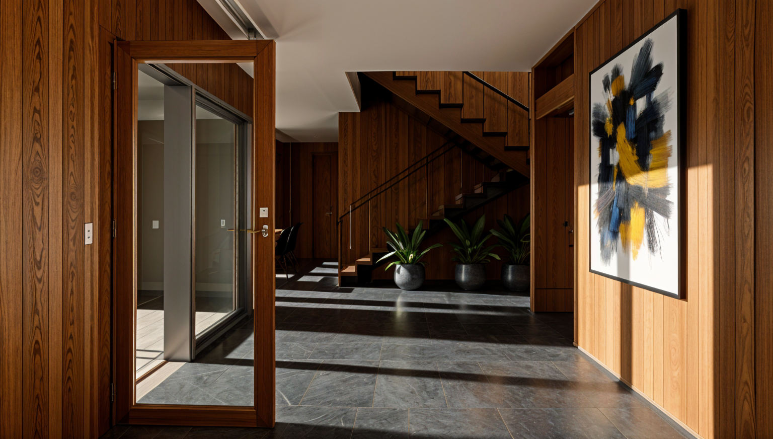 black shingles dark green siding black windows and trim wood columns lanscaping and sunny sky background