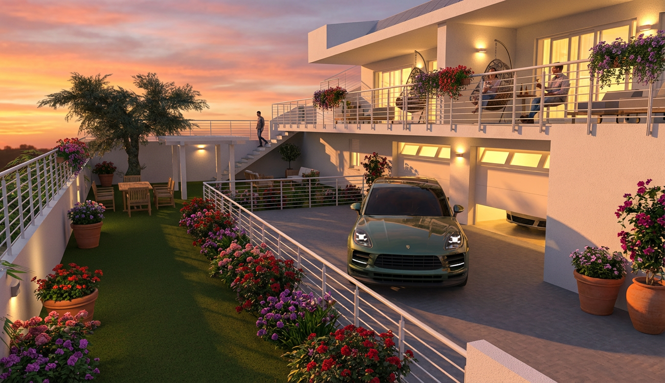 sostituisci auto con roulotte sostituisci prato con terra sostituisci fiori con statue di pantere metti galline sostituisci persone con zingari