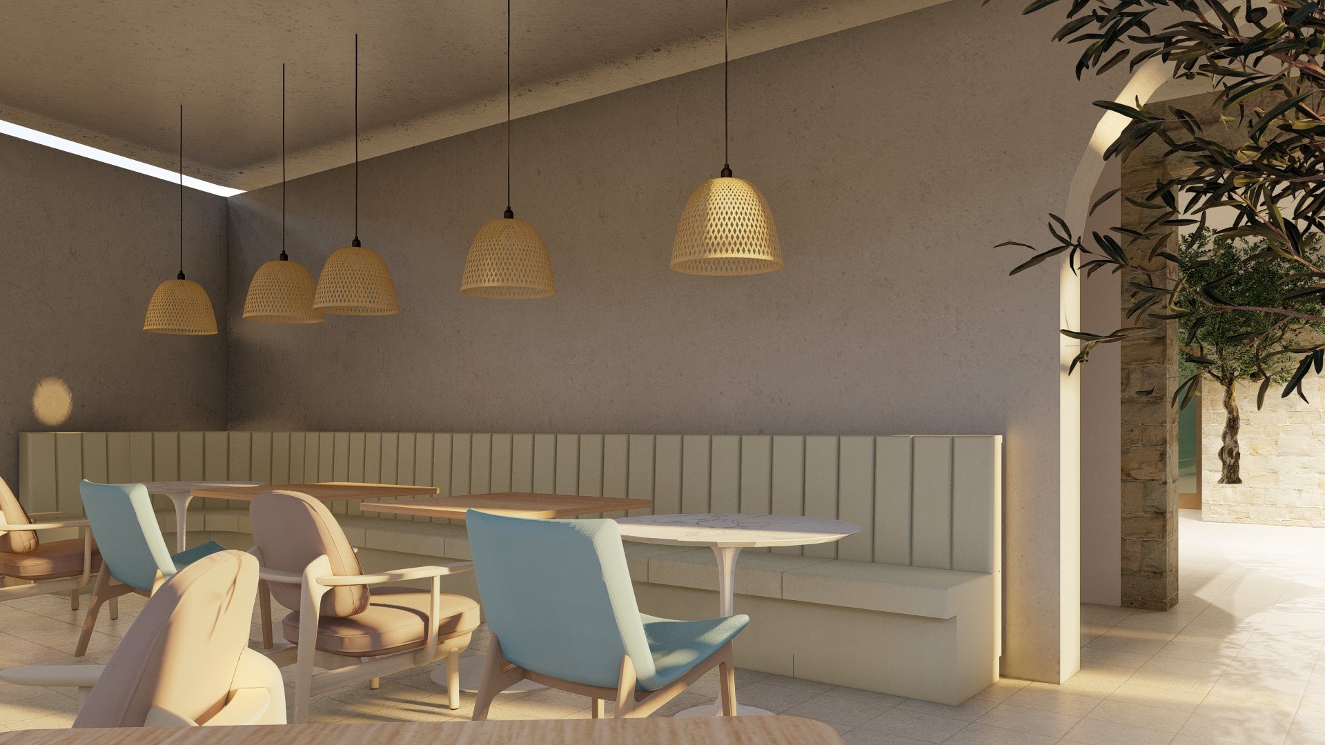 transform this base 3d model into a modern mediterranean tavern caf with authentic coastal charm keep the original geometry but enhance it with natural textures warm limestone walls aged wood beams and matte plaster surfaces add hanging greenery cascading from the ceiling olive tree planters and soft sunlight entering through open windows fill the wooden shelves with assorted wine bottles local spirits and small ceramic details use warm ambient lighting with golden tones and subtle shadows the style should combine rustic mediterranean tradition with modern minimalism natural materials elegant simplicity and artistic composition create a cinematic highly aesthetic and photorealistic atmosphere that feels calm timeless and inviting do this on the base photo as it is different angle of the reference photo