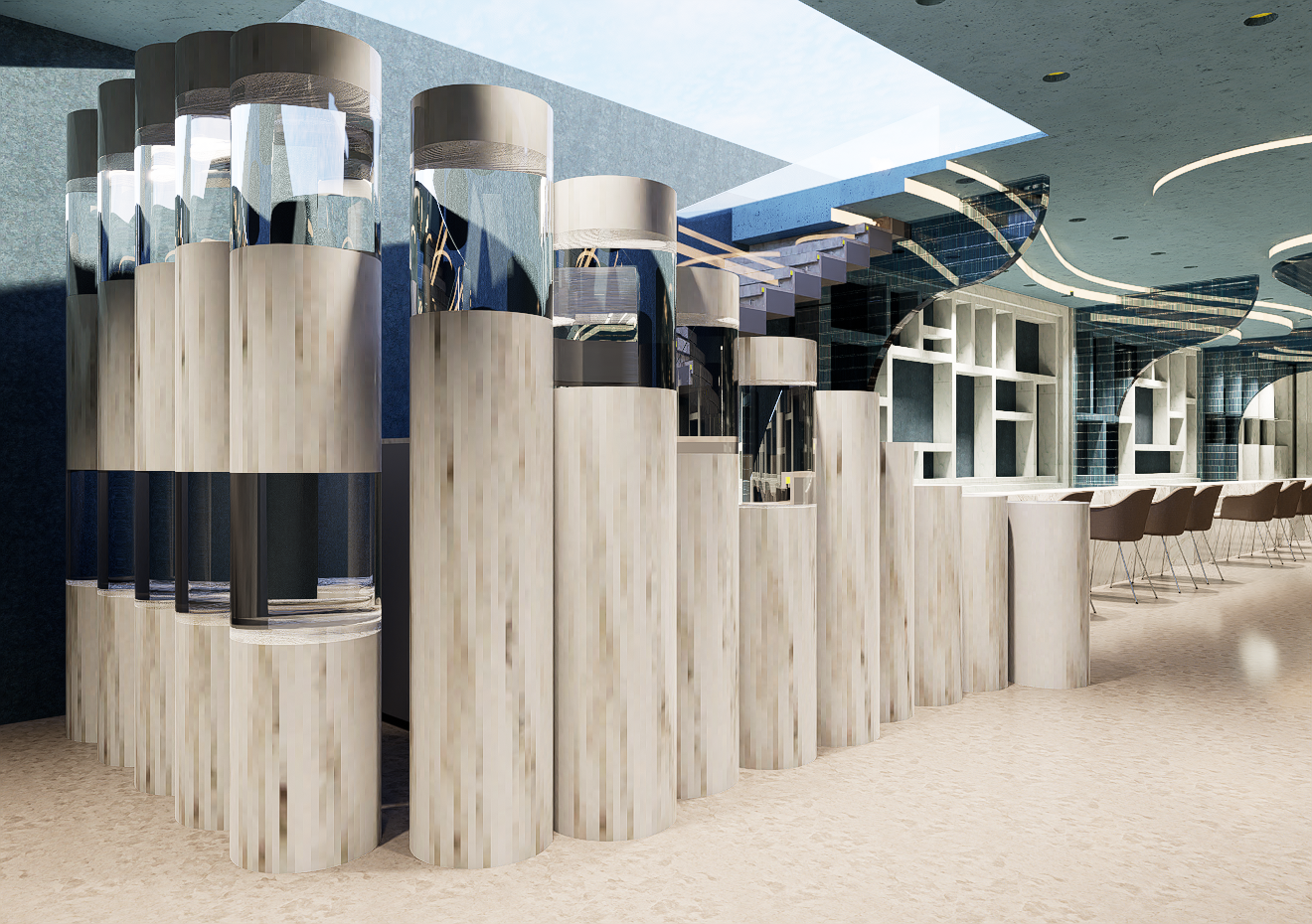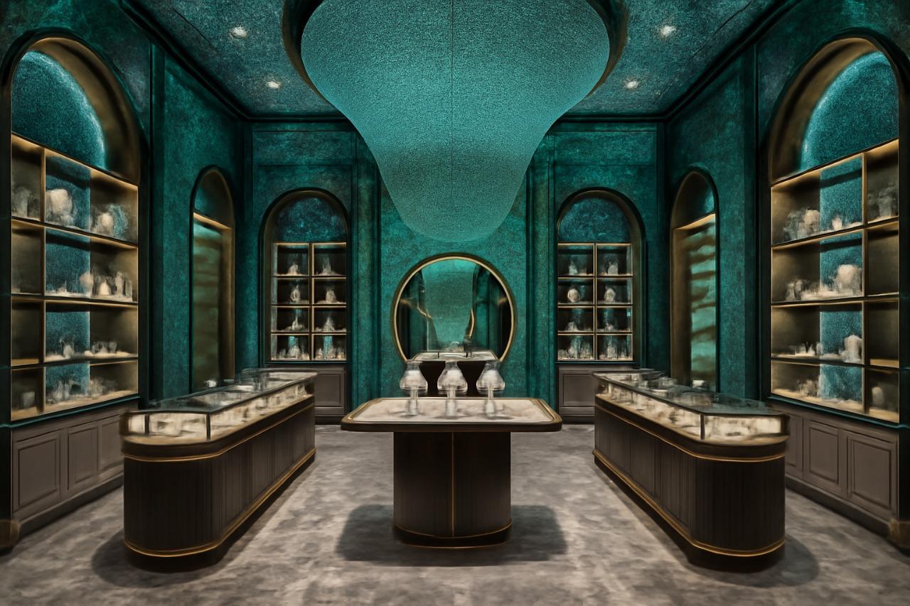 interior shot render a luxurious jewellery store interior inspired by the reference image use the exact same colors materials and finishes as in the reference including the flooring wall treatments shelving design and lighting style maintain the same modern elegant atmosphere add finely detailed jewellery pieces arranged inside the display shelves and counters necklaces rings earrings and bracelets placed on velvet holders and glass cases ensure the jewellery sparkles subtly under the lighting enhancing the sense of luxury keep the space refined minimal and premium with realistic textures and high quality details