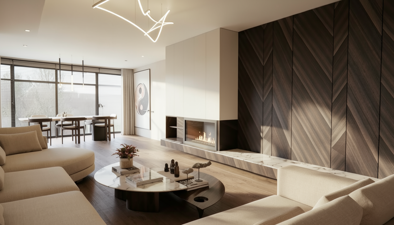 modern minimalist living room interior at night warm ambient lighting curved beige sectional sofa marble and walnut coffee table built in linear fireplace glowing softly dark walnut chevron wall panels floating marble bench oak wood flooring sculptural led ribbon chandelier emitting warm light large floor to ceiling window showing dark night outside cozy luxury atmosphere soft indirect lighting subtle reflections on marble surfaces architectural visualization ultra realistic global illumination interior photography vray render style octane render style cinematic lighting 8k