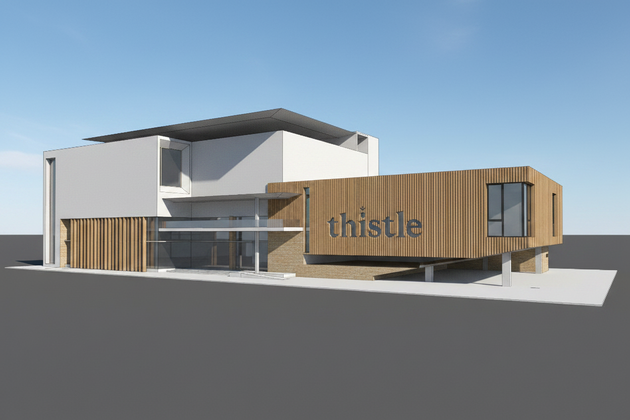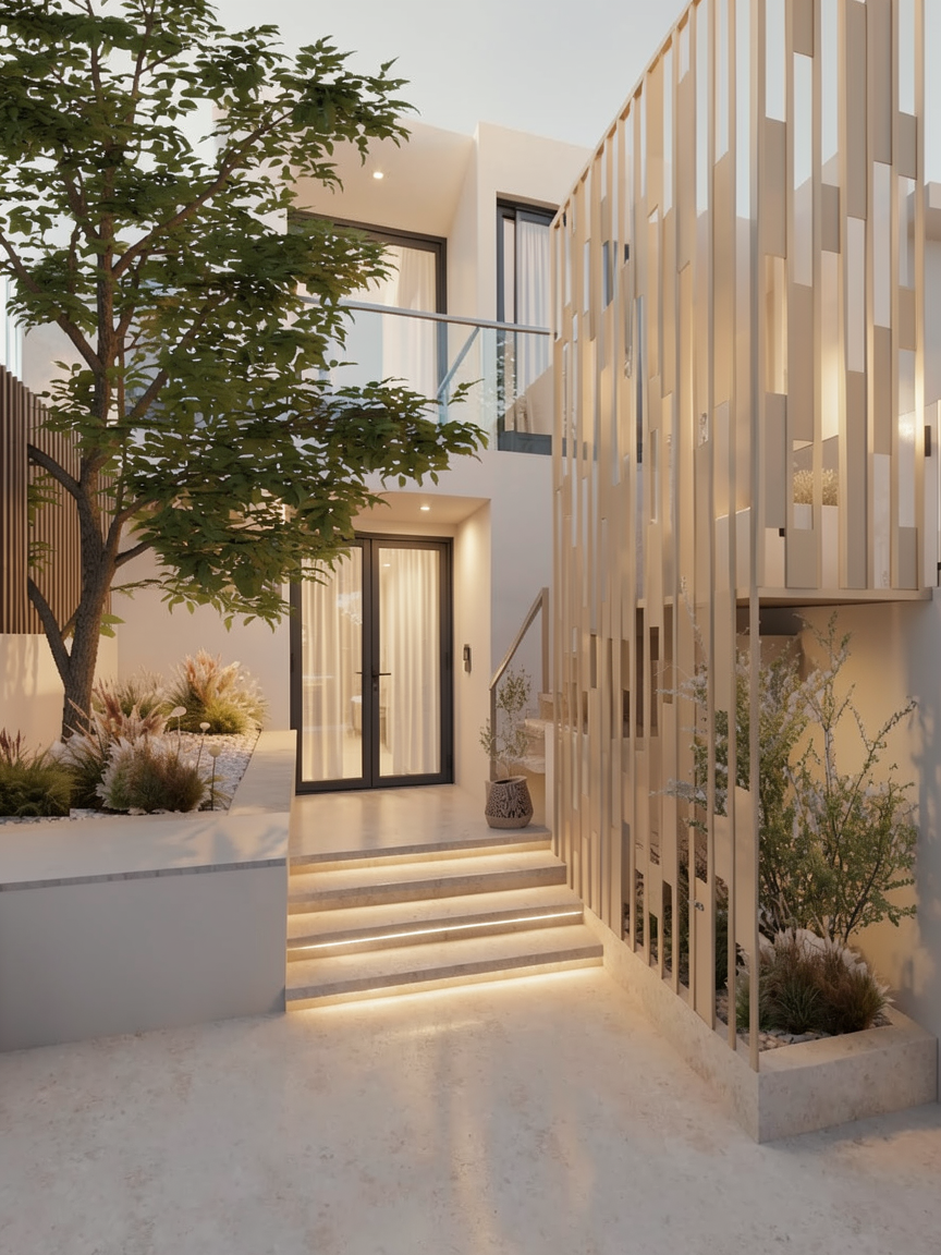 please replace the house s facade with vertical wood look panels in dark walnut featuring a realistic wood grain clean modern architecture minimalist design an exclusive look natural lighting an ultra realistic appearance and 4k resolution