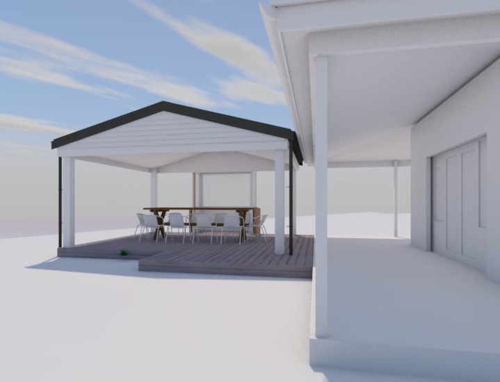 gardens around the outdoor canopy keep original building white show brick veneer on bbq units show clear glass there