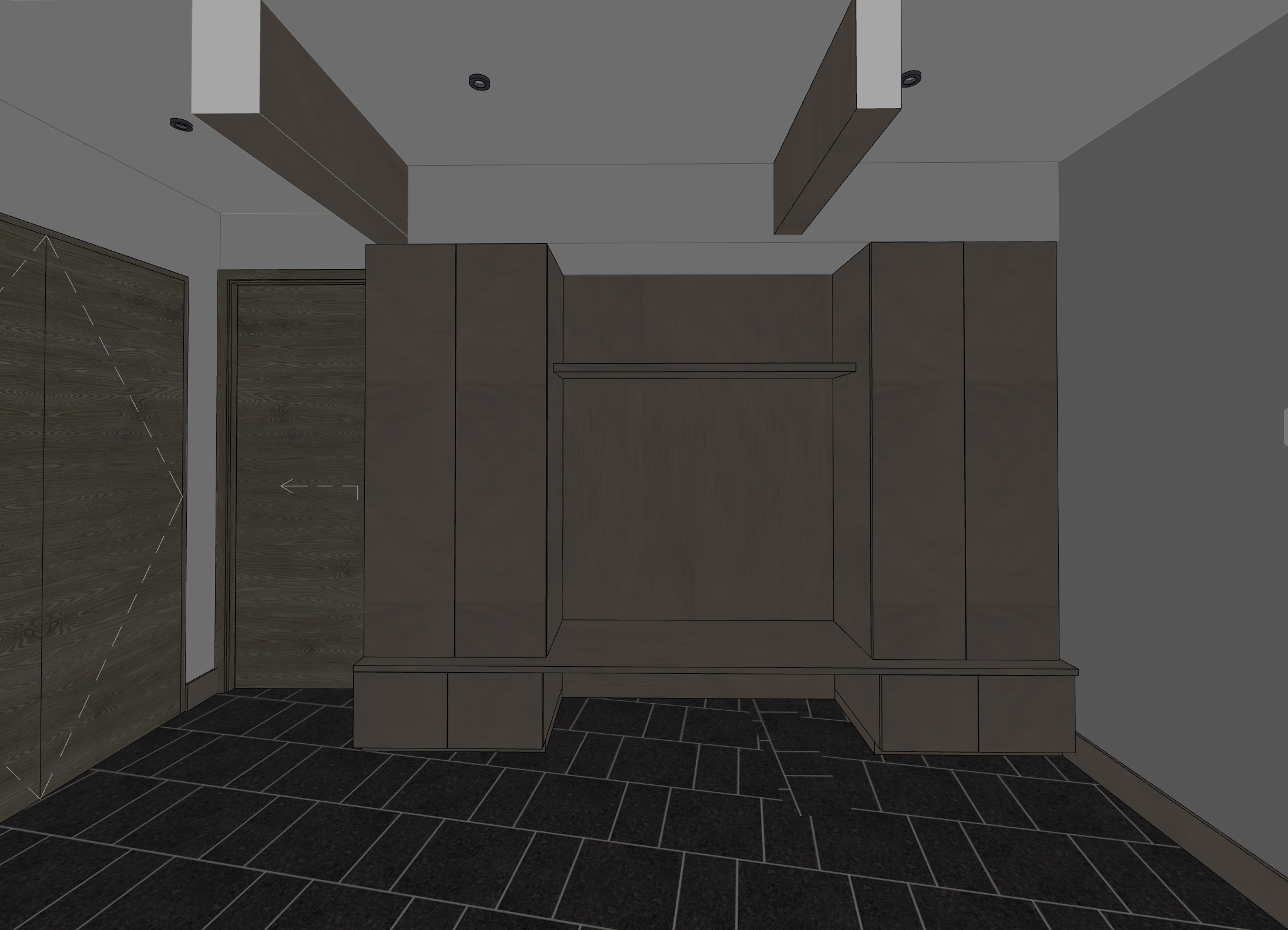 use whitewash oak for the cabinets and doors use navy blue velvet for a seat cushion show the ceiling as white plaster