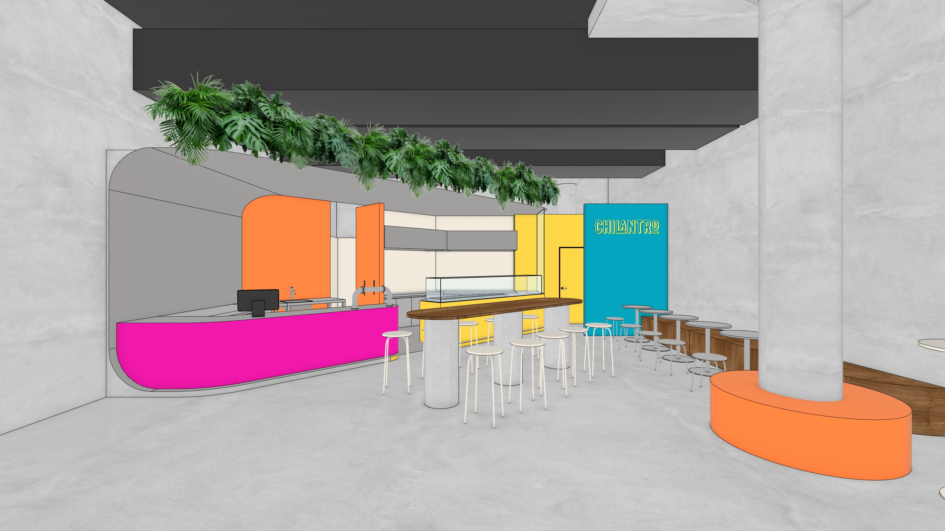 cozy contemporary urban mexican colorful bistro and bar keep original geometry add cactuses into terracota built planter around the pillar grey volume surrounding counter is stainless steel add missing chairs by high tables landscape aspect ratio add mexican contemporary artwork on walls add pillows behind seating on the right side populate with people the magenta counter is made of small matte vertical ceramic tiles in the same colour add light bulb chains