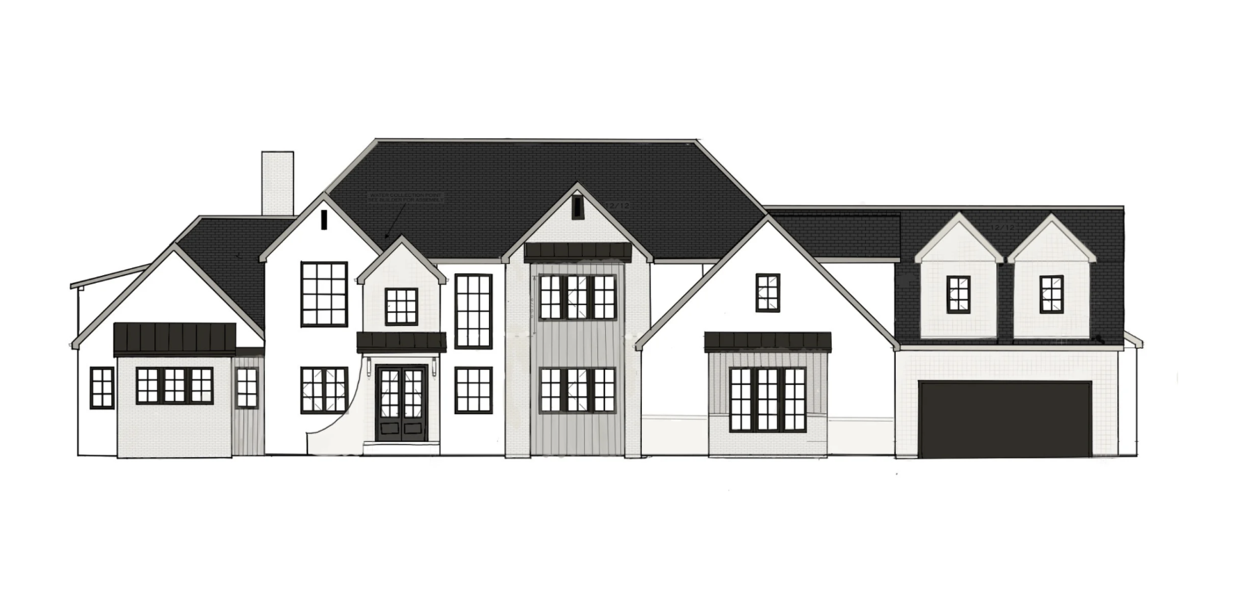 can you make this into an alll white house with brick and stucco and vertical hardie board thin black windows and brown black roof sun burst behind the home