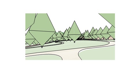 generate hyper realistic visual but with artistic flare of this cad model dont change the view but just make it look real the green structrues are native uk trees make the footpath in a buff colour and add people walking and cyclists make the green open grass park space and make the houses in the distant out of brick and flint and black timber cladding all slightly different but all with grey slate roofs add birds int he sky and some subtle biodiversity in the landscape to make it look naturalistic and welcoming to nature dont change the image design or proportions frame the image on eoither side with hints of a mature hedge as if youre walking through an opening into it to see this park beyond show children playing on the field maybe a few with a footall dont add in houses where they arent shown and make all diamond green shapes into uk native species trees dont add into any housing but ofher than the hint of housing to the right hand side of the image dont make the trees the shape of diamonds like the iage but make them normal trees and conceal some of the houses with planting but just give glimpses