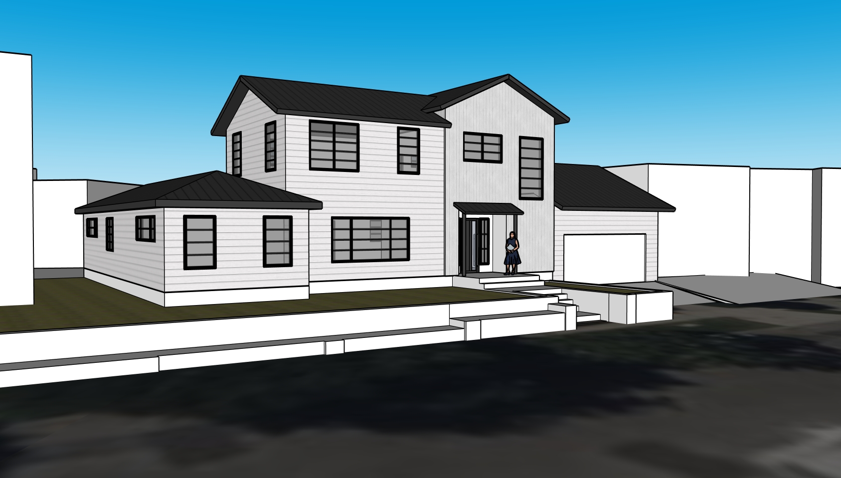 sunny day with a few clouds this view is looking northeast add trees to the front but don t block the house too much add grass and flowers to the front yard and a sidewalk and street in front of the house