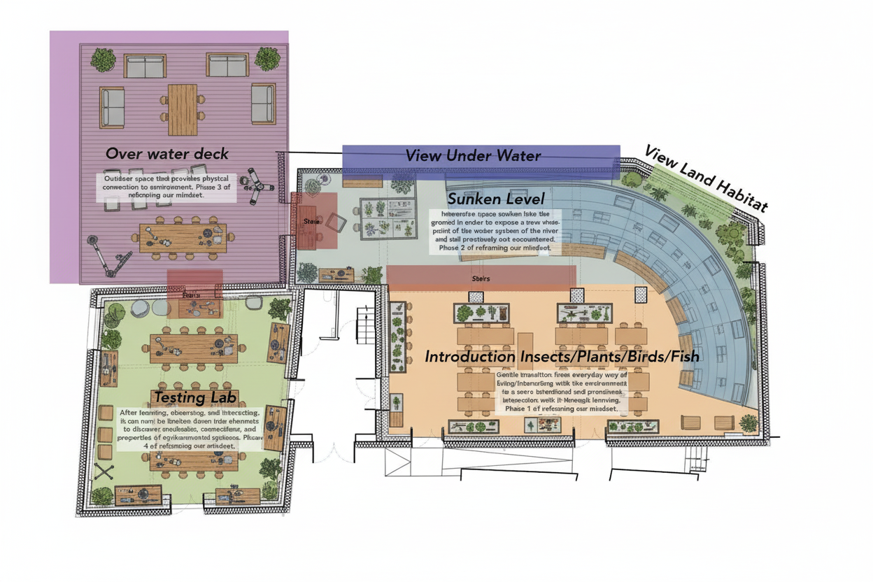 carriage house with vertical shiplap and large grid windows large grid windows covered bridge with large grid windows old stone farmhouse tall grass and driveway in foreground trees in background fog