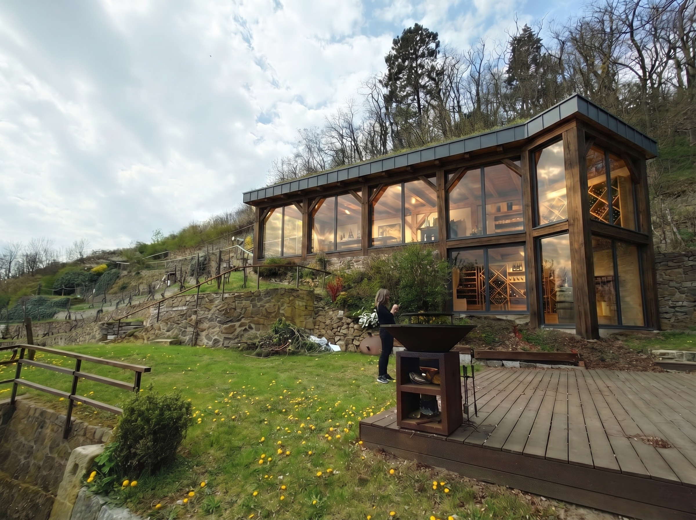 wooden and glass winery prolong to right bottom floor technology in stone right under winery keep surrounding and place change architecture only