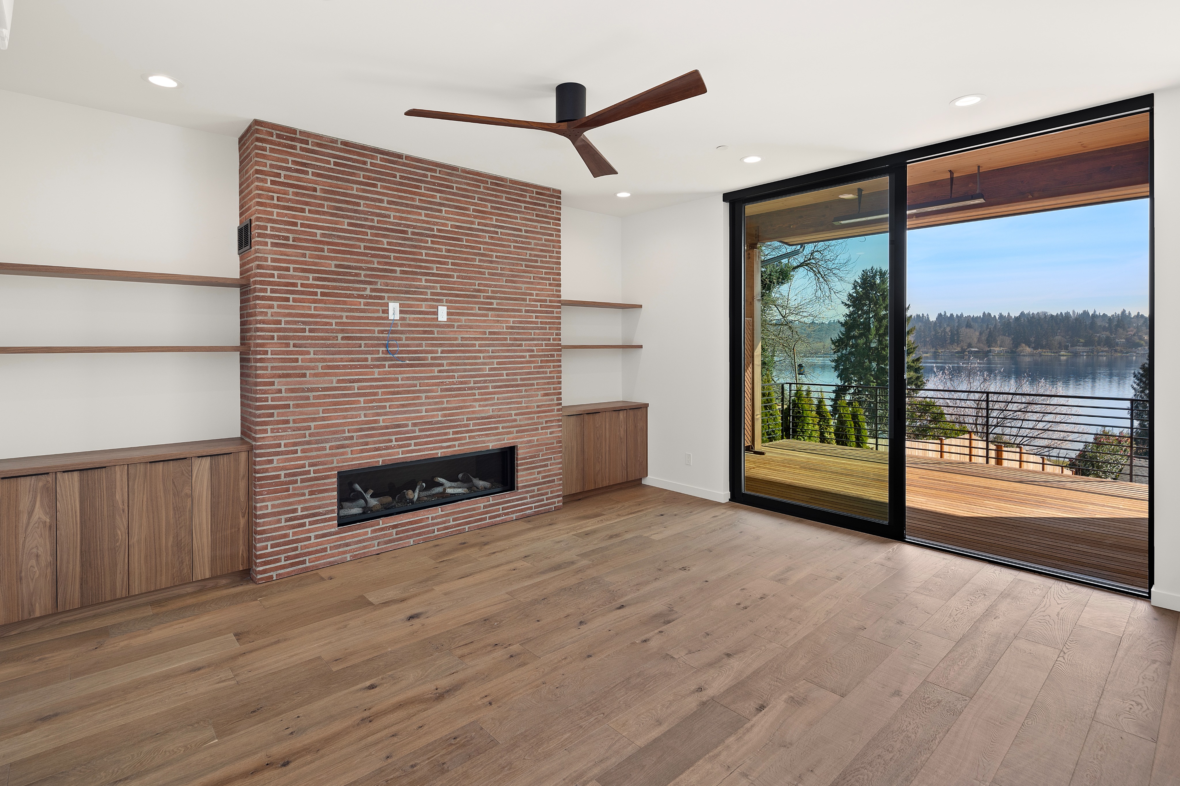 add a low profile elegant natural l shaped couch with a plant in the corner and keep access to the deck open add a blank tv over the fireplace and some plants to the shelves add 2 small patio chairs to the deck