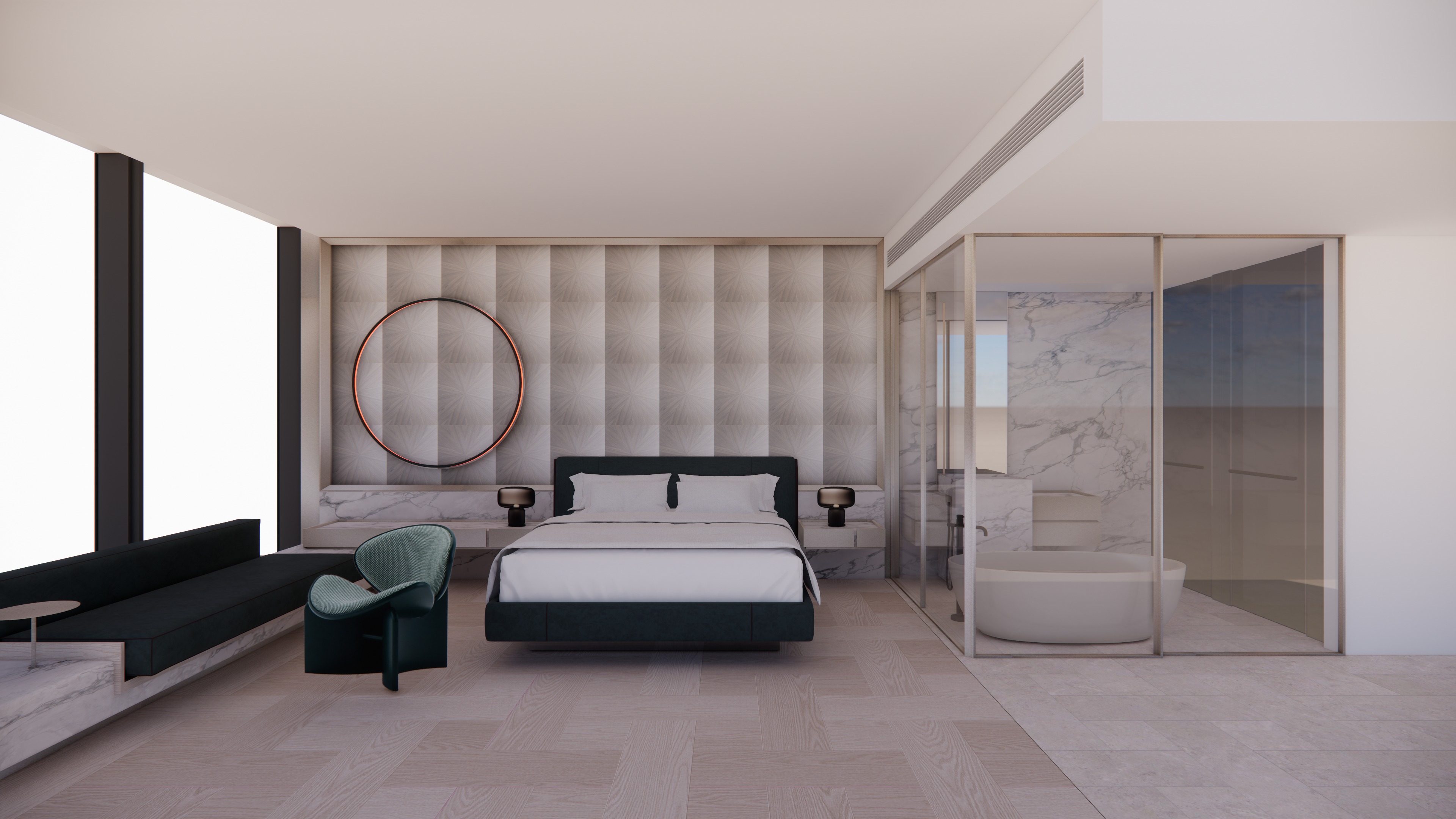 enhance the material realism and overall rendering quality ensure all table lamps are switched on and properly illuminated to create a warm inviting atmosphere this is a luxury hotel room design refine textures finishes reflections and lighting to achieve a high end elegant and photorealistic appearance maintain a calm sophisticated mood suitable for a premium hospitality interior do not change the design layout camera angle or material proposal keep all original materials and object positions exactly as provided produce a clean professional photorealistic architectural render with a luxury hotel ambiance