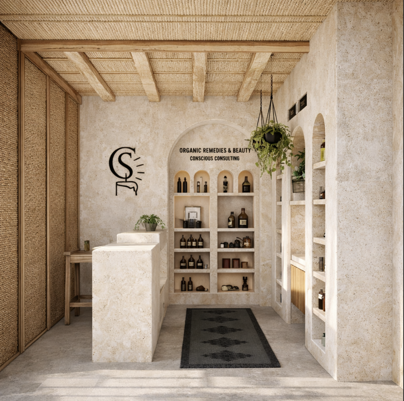create a photorealistic image showing a pop up kiosk displaying upmarket soaps and candles the wall and floor finish is travertine with open reeded left hand wall and ceiling in natural textures behind the glass shelving is a transparent glass window onto the shopping mall lighting is soft recesses led downlights and led strip lighting in the display alcoves