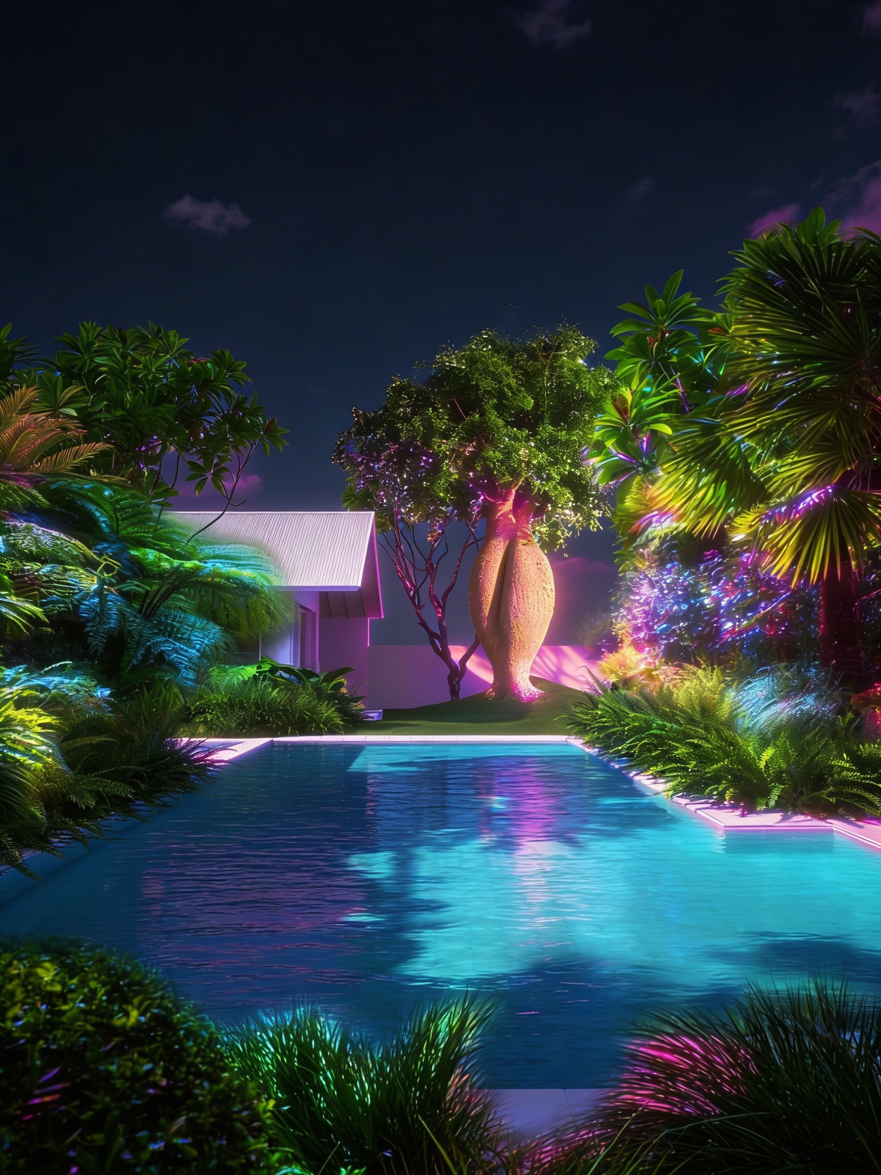 enhance the realistic texture and night lighting with psychedelic indirect light to the vegetation and trees set the camera apperture into f 35