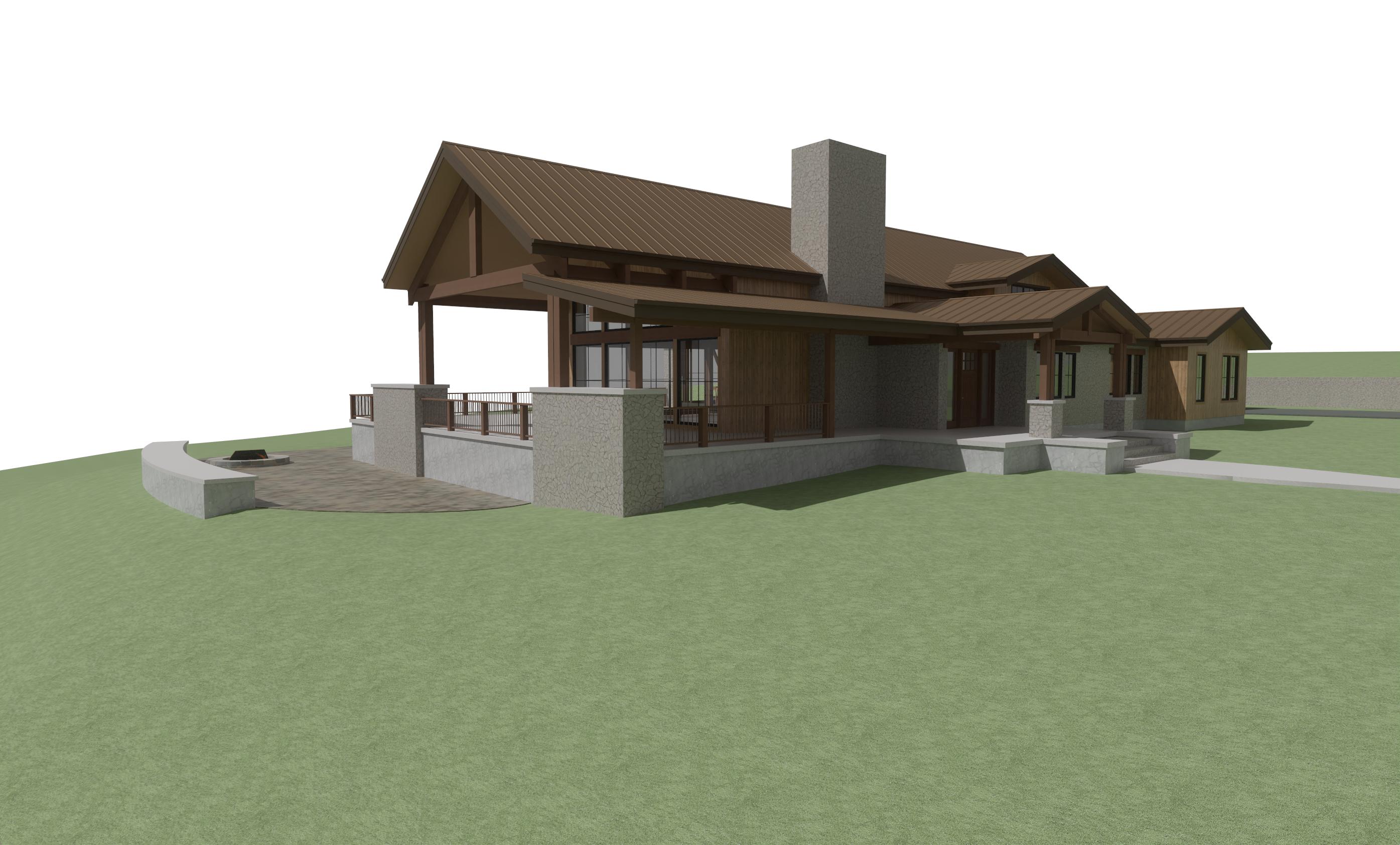 this in montana use native montana trees and vegetation make wood siding ghost wood like jackson hole but leave the rock siding dont change the rock siding just make it more realistic there is rock on the smaller gable to the left make golden hour outside show golden light coming from inside make roof copper standing seam roof make rock on concrete on foundation do not change the shape of the structur or window sizes there is rock slab patio on left side of porch keep rock on walls no trees to the left make small mountain far off in distance to the right create a realistic elevation of the architectural design maintaining the original materials of lap siding and board and batten in their correct locations enhance the lighting and shadows for a lifelike effect but ensure that the texture and arrangement of both siding types remain exactly as in the original design make sure to keep the rock on the walls the same the background is and open field with montana trees far off in distance add rock to foundation walls add trees far off in distance