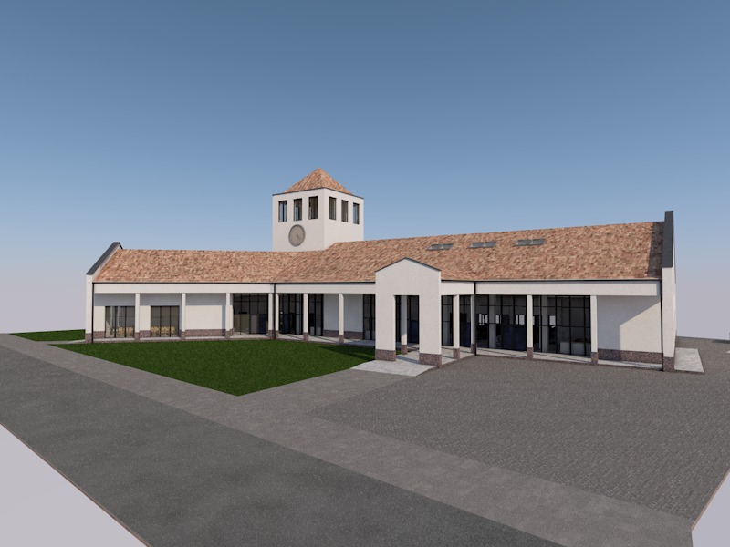 wide angle exterior architectural visualization of project description midday neutral cool natural daylight no artificial lighting visible balanced exposure medium low saturation controlled contrast corporate architectural photography style no cinematic effects no dramatic sky no warm tones clear pale blue sky with minimal soft clouds vegetation in muted olive green tones low vibrancy landscaping engineered and maintained environment clean materials without wear clear material differentiation architectural mass reads before texture subtle structural emphasis systemic spatial clarity investor oriented tone subtle emotional trigger of stability and competence ultra realistic high resolution professional architectural documentation style no sunset lighting no golden hour no warm color cast no cinematic atmosphere no dramatic fog no lens flare no oversaturated colors no lifestyle staging no artistic grain no excessive depth of field blur