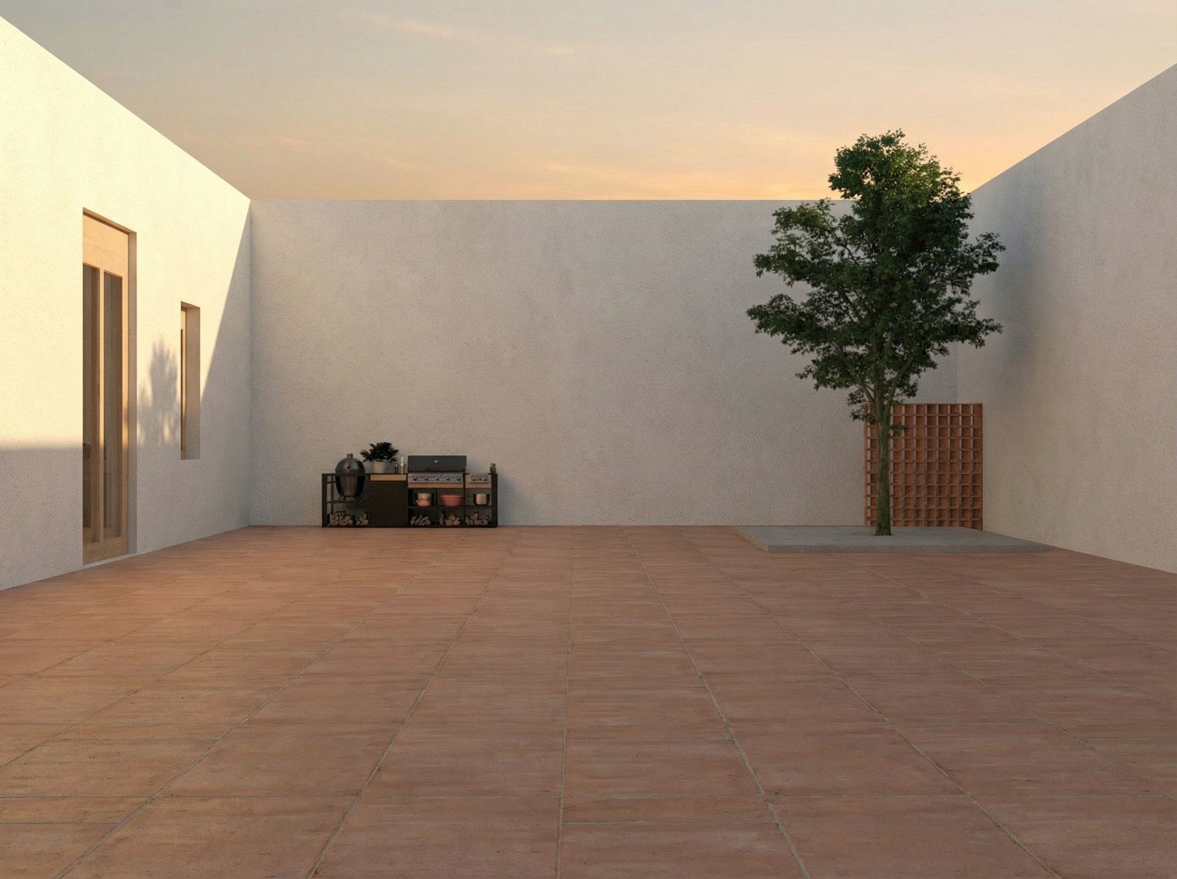 render a serene courtyard at sunset featuring terracotta tiled flooring with warm earthy tones the minimalist white walls should capture the soft glow of the setting sun include a vibrant green tree on the right side casting gentle shadows on the left incorporate a rustic barbecue area with a mix of muted black and metallic textures ensure the sky displays a gentle gradient from soft oranges to delicate pinks enhancing the tranquil atmosphere