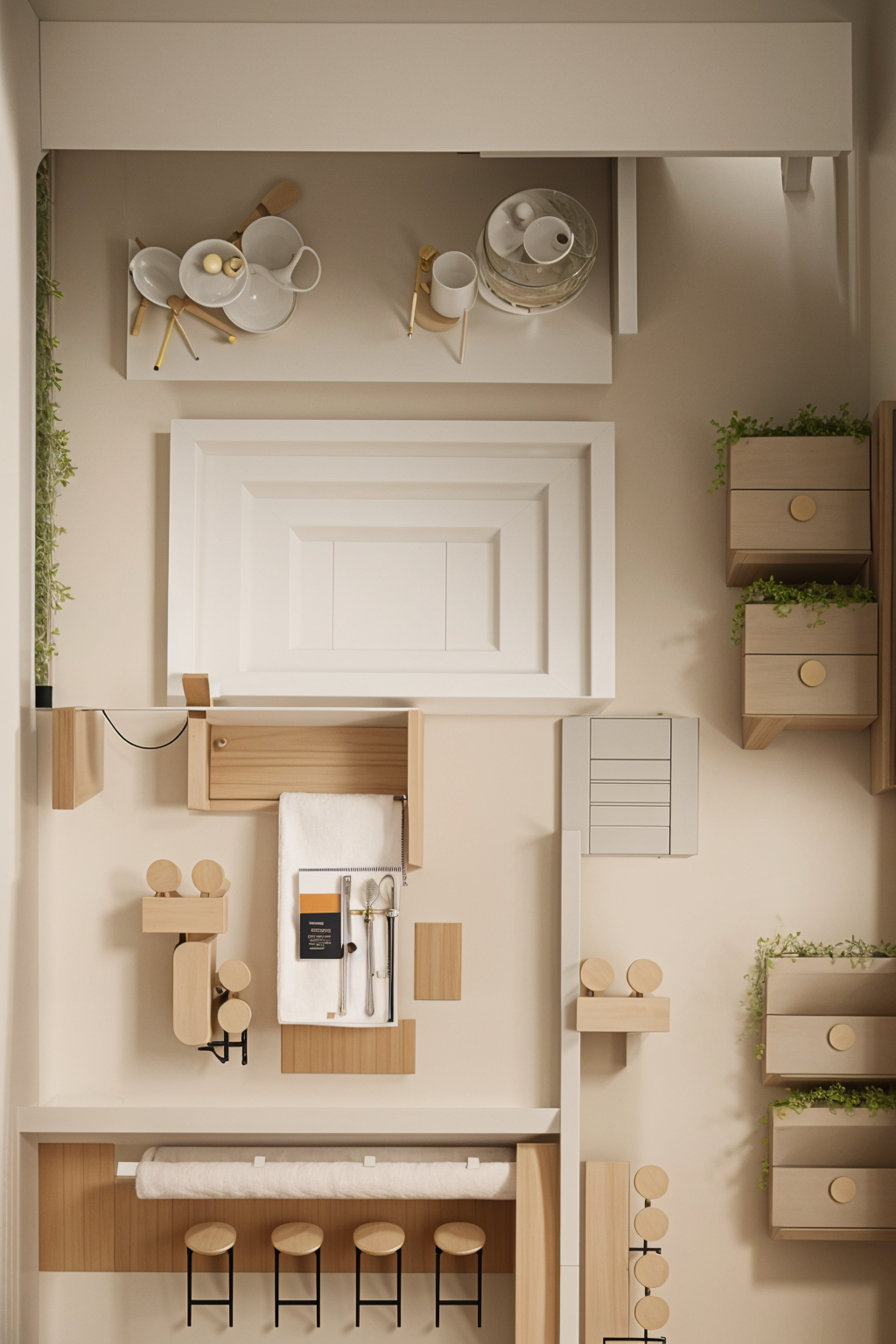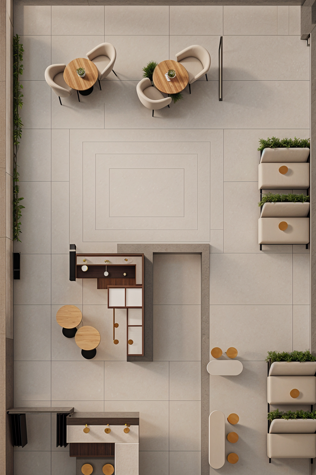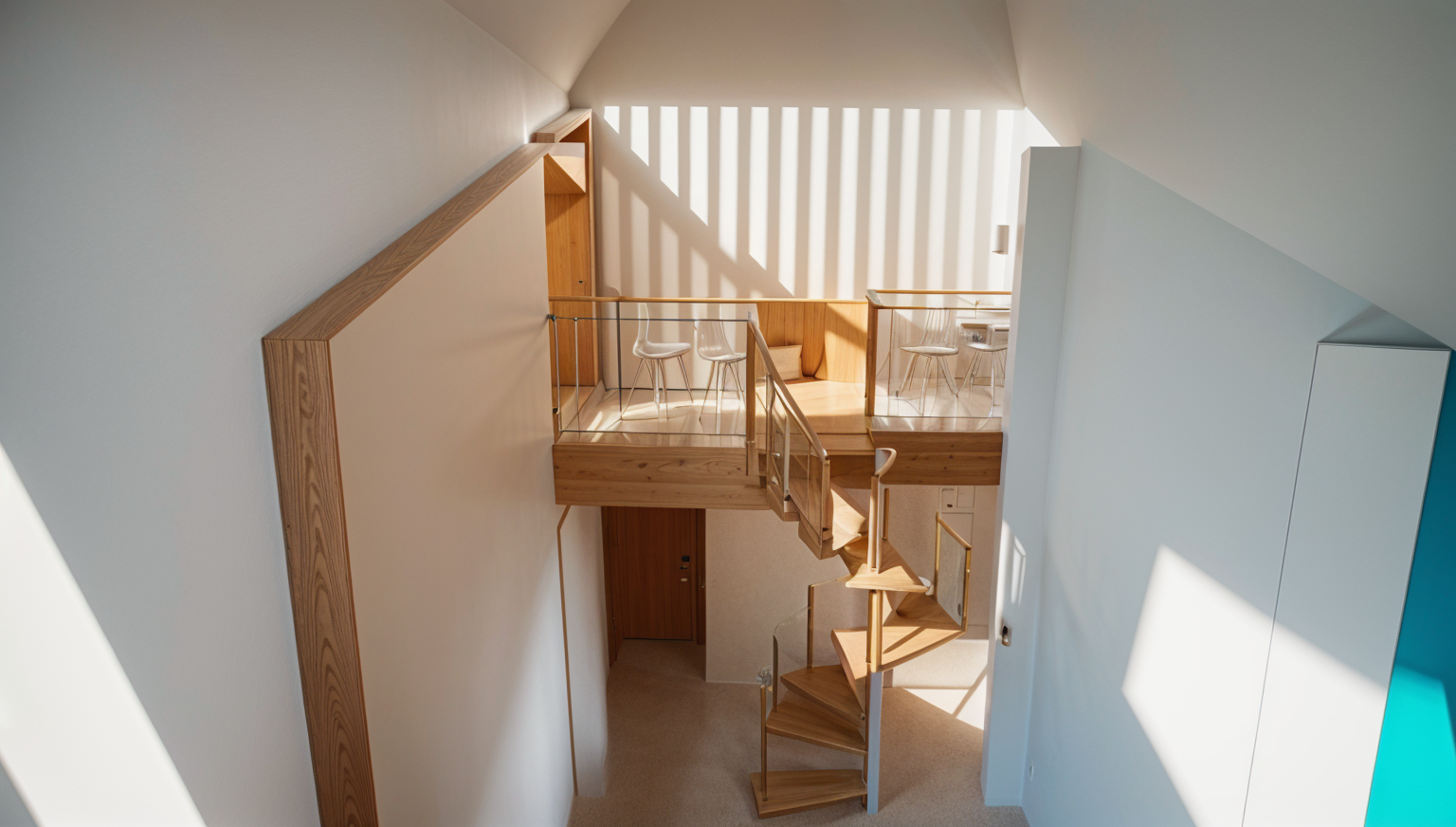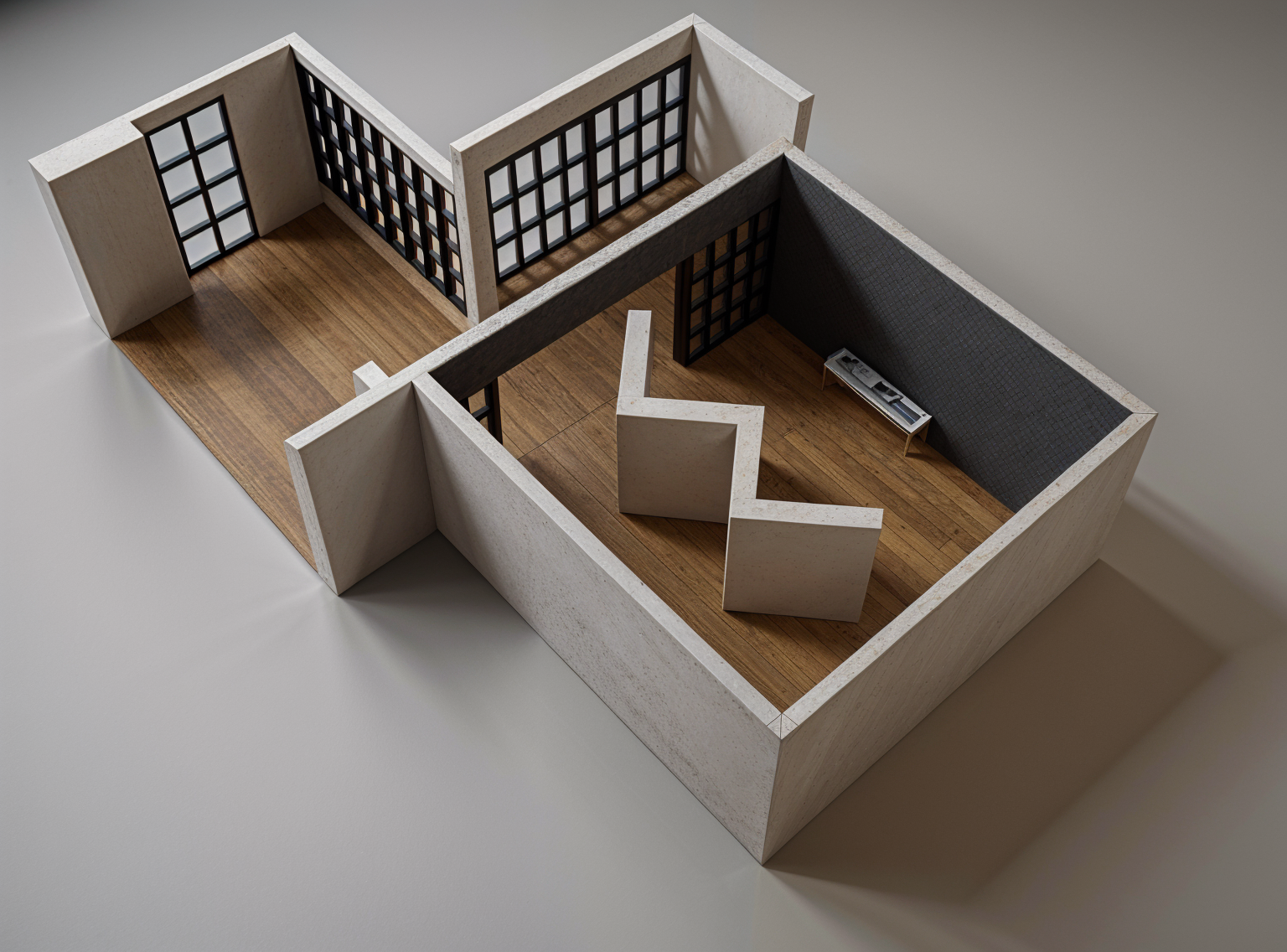 looking through a corridor to an art gallery with a cushioned bench in behind it