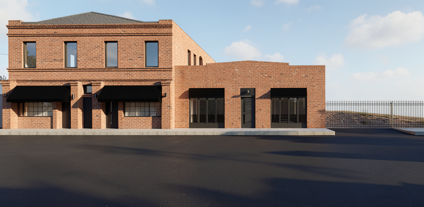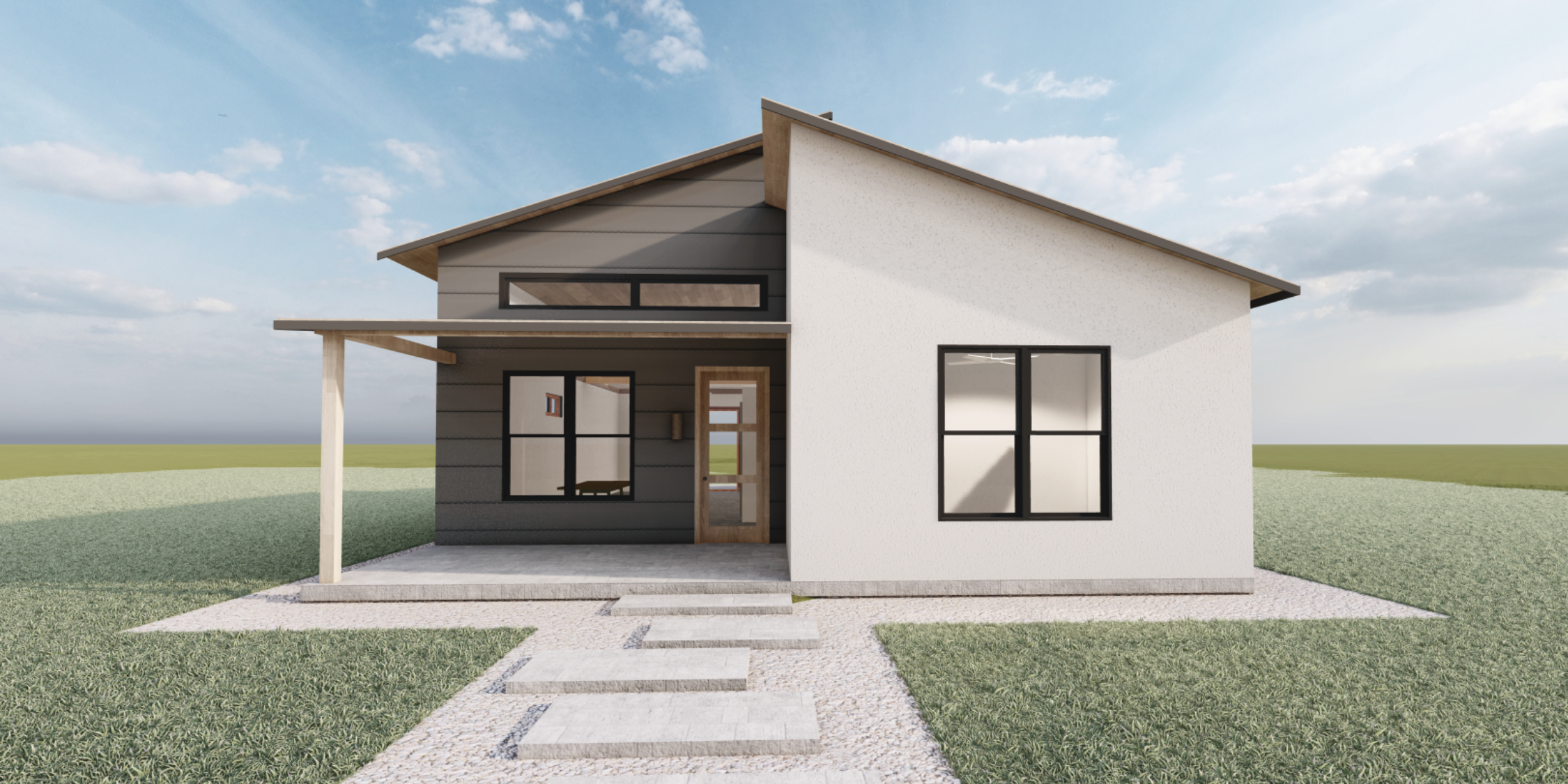make this more realistic enhance the materials daylight and airy atmosphere with clouds the lights are dimly visible through the windows the environment is central texas with trees and a residential fence